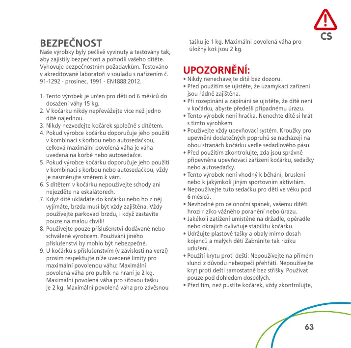 BEZPEČNOST Naše výrobky byly pečlivě vyvinuty a testovány tak, aby zajistily bezpečnost a pohodlí vašeho dítěte. Vyhovuje bezpečnostním požadavkům. Testováno v akreditované laboratoři v souladu s nařízením č. 91-1292 - prosinec, 1991 - EN1888:2012. 1. Tento výrobek je určen pro děti od 6 měsíců do dosažení váhy 15 kg. 2. V kočárku nikdy nepřevážejte více než jedno dítě najednou. 3. Nikdy nezvedejte kočárek společně s dítětem. 4. Pokud výrobce kočárku doporučuje jeho použití v kombinaci s korbou nebo autosedačkou, celková maximální povolená váha je váha uvedená na korbě nebo autosedačce. 5. Pokud výrobce kočárku doporučuje jeho použití v kombinaci s korbou nebo autosedačkou, vždy je nasměrujte směrem k vám. 6. S dítětem v kočárku nepoužívejte schody ani nejezděte na eskalátorech. 7. Když dítě ukládáte do kočárku nebo ho z něj vyjímáte, brzda musí být vždy zajištěna. Vždy používejte parkovací brzdu, i když zastavíte pouze na malou chvíli! 8. Používejte pouze příslušenství dodávané nebo schválené výrobcem. Používání jiného příslušenství by mohlo být nebezpečné. 9. U kočárků s příslušenstvím (v závislosti na verzi) prosím respektujte níže uvedené limity pro maximální povolenou váhu: Maximální povolená váha pro pultík na hraní je 2 kg. Maximální povolená váha pro síťovou tašku je 2 kg. Maximální povolená váha pro závěsnou
