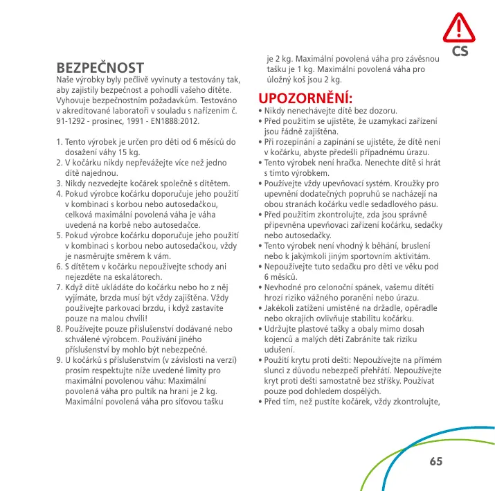 BEZPEČNOST Naše výrobky byly pečlivě vyvinuty a testovány tak, aby zajistily bezpečnost a pohodlí vašeho dítěte. Vyhovuje bezpečnostním požadavkům. Testováno v akreditované laboratoři v souladu s nařízením č. 91-1292 - prosinec, 1991 - EN1888:2012. 1. Tento výrobek je určen pro děti od 6 měsíců do dosažení váhy 15 kg. 2. V kočárku nikdy nepřevážejte více než jedno dítě najednou. 3. Nikdy nezvedejte kočárek společně s dítětem. 4. Pokud výrobce kočárku doporučuje jeho použití v kombinaci s korbou nebo autosedačkou, celková maximální povolená váha je váha uvedená na korbě nebo autosedačce. 5. Pokud výrobce kočárku doporučuje jeho použití v kombinaci s korbou nebo autosedačkou, vždy je nasměrujte směrem k vám. 6. S dítětem v kočárku nepoužívejte schody ani nejezděte na eskalátorech. 7. Když dítě ukládáte do kočárku nebo ho z něj vyjímáte, brzda musí být vždy zajištěna. Vždy používejte parkovací brzdu, i když zastavíte pouze na malou chvíli! 8. Používejte pouze příslušenství dodávané nebo schválené výrobcem. Používání jiného příslušenství by mohlo být nebezpečné. 9. U kočárků s příslušenstvím (v závislosti na verzi) prosím respektujte níže uvedené limity pro maximální povolenou váhu: Maximální povolená váha pro pultík na hraní je 2 kg. Maximální povolená váha pro síťovou tašku