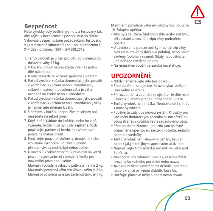 • Le fait d’accrocher une charge au poussoir, dossier ou côtés influe sur la stabilité du landau/ de la poussette.