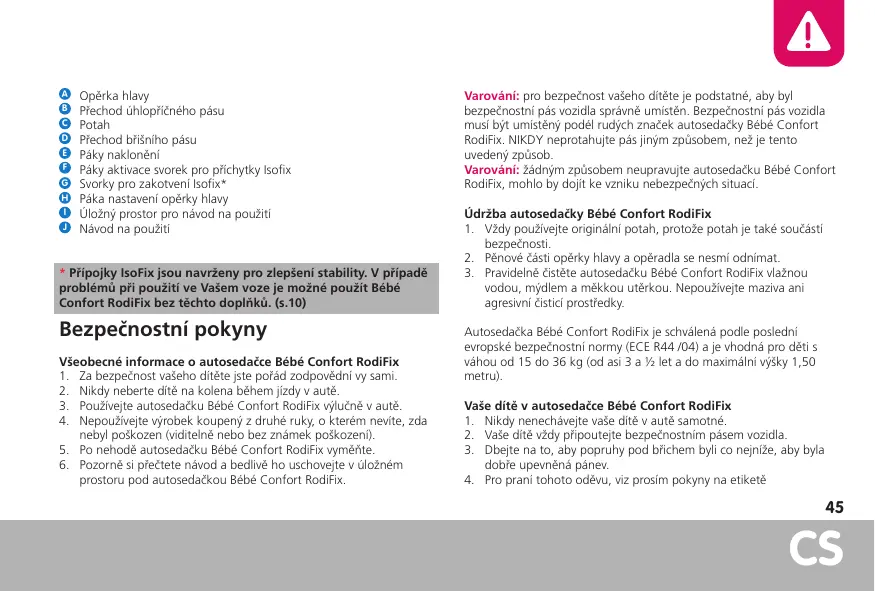 Opèrka hlauy Prechod ühlopriëného pésu Potah Prechod biisniho pésu Péky naklonëni Péky aktivace svorek pro prichytky Isofix Svorky pro zakotwent sofix* Péka nastaveni opérky hlawy Üloënÿ prostor pro nâvod na pouziti Névod na pouiti Bezpeënostni pokyny Vseobecné informace o autosedaëce Bébé Confort RodiFix ‘Za bezpeënost vaseho ditète ste pofäd zodpovédni vy sami. Nikdy neberte dit& na kolena bêhem jid v auté. Pouñivejte autosedaëku Bébé Confort Rodifix wjluëné v auté. Nepouzivejte wjrobek koupenÿ z druhé ruky o kterém nevite, zda nebyl pogkozen (vditelné nebo bez anâmek poikozeni, Po nehodë autosedatku Bébé Confort RodiFix vyméfte. Pozornë si preëtete névod à bedivé ho uschovelte v dloëném prostoru pod autosedaëkou Bébé Confort RodiFix