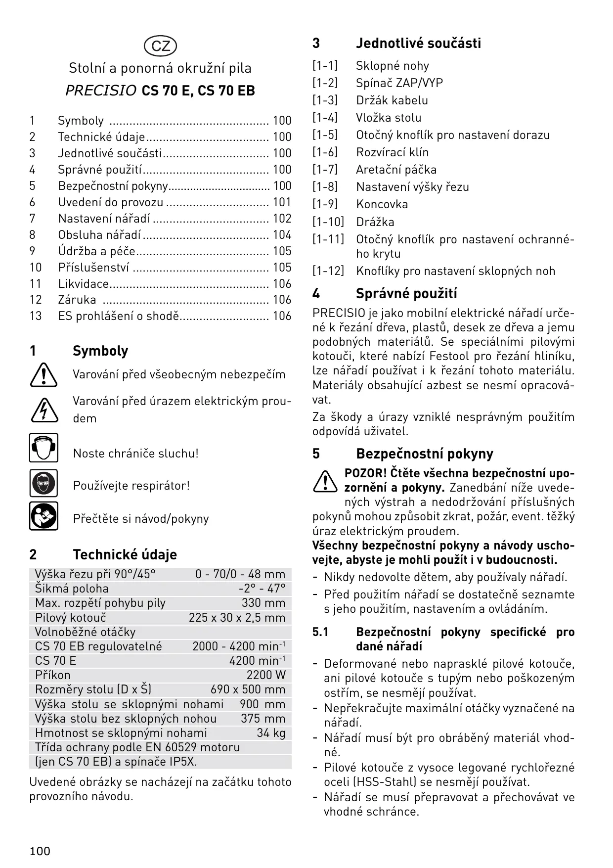 Šikmá poloha -2° - 47° Max. rozpětí pohybu pily 330 mm Pilový kotouč 225 x 30 x 2,5 mm Volnoběžné otáčky CS 70 EB regulovatelné 2000 - 4200 min-1 CS 70 E 4200 min-1 Příkon 2200 W Rozměry stolu (D x Š) 690 x 500 mm Výška stolu se sklopnými nohami 900 mm Výška stolu bez sklopných nohou 375 mm Hmotnost se sklopnými nohami 34 kg Třída ochrany podle EN 60529 motoru (jen CS 70 EB) a spínače IP5X. Uvedené obrázky se nacházejí na začátku tohoto provozního návodu.