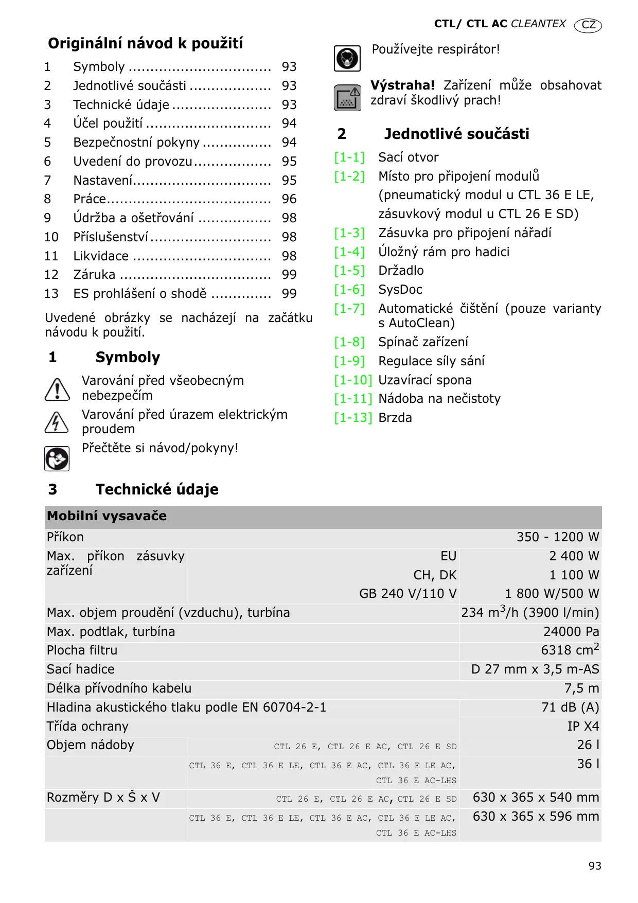 Mobilni vysavaée Hmotnost CTL 26 E, CTL 26 E SD 13,9 kg CTL 36E, CTL 36E LE 14,4 kg CTL 26 E AC 14,7 kg CTL 36 E AC, CTL 36 E LE AC, CTL 36 E AC-LHS 15,2 kg 4 Üëel pouiti dodr?ovat bezpeënostni p'edpisy platné ve Mobilni vysavate jsou na zékladëé svého uréeni vhodné pro vysäväni a odsäväni zdravi #kodlivého prachu s hodnotami do 1 mg/m3 odpovidajiciho tridé prachu ‘’L' podle IEC 60335-2-69. Mobilni vysavaë je uréen k vysävéni vody. Mobilni vysavat je podle EN 60335-1 a EN 60335-2-69 vhodnÿ pro zvÿéené näroky pri profesionälnim pouziti.. A Za ëkody a ürazy vzniklé nesprävnÿm pouzitim odpovidä uzivatel. 5 Bezpeënostni pokyny Vyÿstraha! Prectète si bezpeënostni pokyny a instrukce. Chyba pri dodrzoväni varovnÿch upozornéni a instrukci mûze zpüsobit zäsah elektrickÿm proudem, poZär a/nebo väzné zranëni. Véechny bezpeënostni pokyny a nävody uschovejte, abyste je mohli pouzit i v budoucnosti. - Toto zaïizeni nesmi pouZivat osoby (véetnë déti) s omezenÿmi fyzickÿmi, smyslovÿmi nebo duëevnimi schopnostmi nebo bez prisluënÿch zku$enosti a/nebo védomosti, kromë pipadü, kdy na jejich bezpeënost dohliZi kompetentni osoba nebo je tato osoba instruuje, jak se zaïizeni pouZivä. Na déti je nutné dohlizet, aby bylo zajisténo, Ze si se zaïizenim nebudou hrét. T e SE 1 - Vÿstraha: Zaïizeni mû?e obsahovat zdravi Skodlivÿ prach. Vyprazdñoväni a üdrzbu, véetné vÿméëny filtru, smi provädëét pouze véechny autorizovani odbornici s vhodnyÿmi ochrannÿmi pomückami. Zaïizeni nepouzivejte bez kompletné namontovaného filtraëniho systému. - Pi manipulaci se zdravi Skodlivÿm prachem a jeho odsäväni je bezpodmineëné nutné