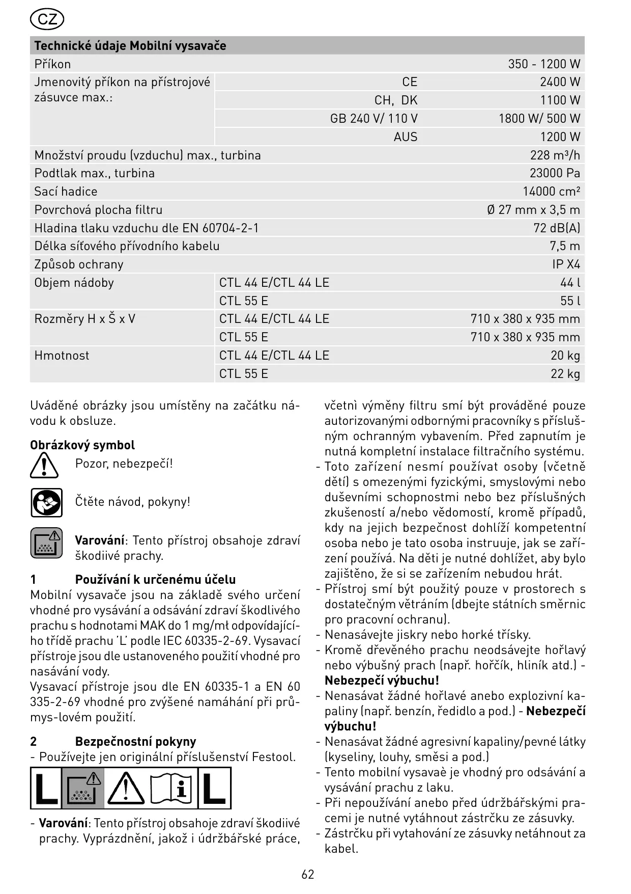 2400 W 1100 W 1800 W/ 500 W 1200 W 228 m³/h 23000 Pa 14000 cm² Ø 27 mm x 3,5 m 72 dB(A) 7,5 m IP X4 44 l 55 l 710 x 380 x 935 mm 710 x 380 x 935 mm 20 kg 22 kg včetnì výměny filtru smí být prováděné pouze autorizovanými odbornými pracovníky s příslušným ochranným vybavením. Před zapnutím je nutná kompletní instalace filtračního systému. - Toto zařízení nesmí používat osoby (včetně dětí) s omezenými fyzickými, smyslovými nebo duševními schopnostmi nebo bez příslušných zkušeností a/nebo vědomostí, kromě případů, kdy na jejich bezpečnost dohlíží kompetentní osoba nebo je tato osoba instruuje, jak se zařízení používá. Na děti je nutné dohlížet, aby bylo zajištěno, že si se zařízením nebudou hrát. - Přístroj smí být použitý pouze v prostorech s dostatečným větráním (dbejte státních směrnic pro pracovní ochranu). - Nenasávejte jiskry nebo horké třísky. - Kromě dřevěného prachu neodsávejte hořlavý nebo výbušný prach (např. hořčík, hliník atd.) Nebezpečí výbuchu! - Nenasávat žádné hořlavé anebo explozivní kapaliny (např. benzín, ředidlo a pod.) - Nebezpečí výbuchu! - Nenasávat žádné agresivní kapaliny/pevné látky (kyseliny, louhy, směsi a pod.) - Tento mobilní vysavaè je vhodný pro odsávání a vysávání prachu z laku. - Při nepoužívání anebo před údržbářskými pracemi je nutné vytáhnout zástrčku ze zásuvky. - Zástrčku při vytahování ze zásuvky netáhnout za kabel. Obrázkový symbol Pozor, nebezpečí! Čtěte návod, pokyny! Varování: Tento přístroj obsahoje zdraví škodiivé prachy. Používání k určenému účelu Mobilní vysavače jsou na základě svého určení vhodné pro vysávání a odsávání zdraví škodlivého prachu s hodnotami MAK do 1 mg/mł odpovídajícího třídě prachu ’L’ podle IEC 60335-2-69. Vysavací přístroje jsou dle ustanoveného použití vhodné pro nasávání vody. Vysavací přístroje jsou dle EN 60335-1 a EN 60 335-2-69 vhodné pro zvýšené namáhání při průmys-lovém použití. Bezpečnostní pokyny - Používejte jen originální příslušenství Festool. - Varování: Tento přístroj obsahoje zdraví škodiivé prachy. Vyprázdnění, jakož i údržbářské práce,