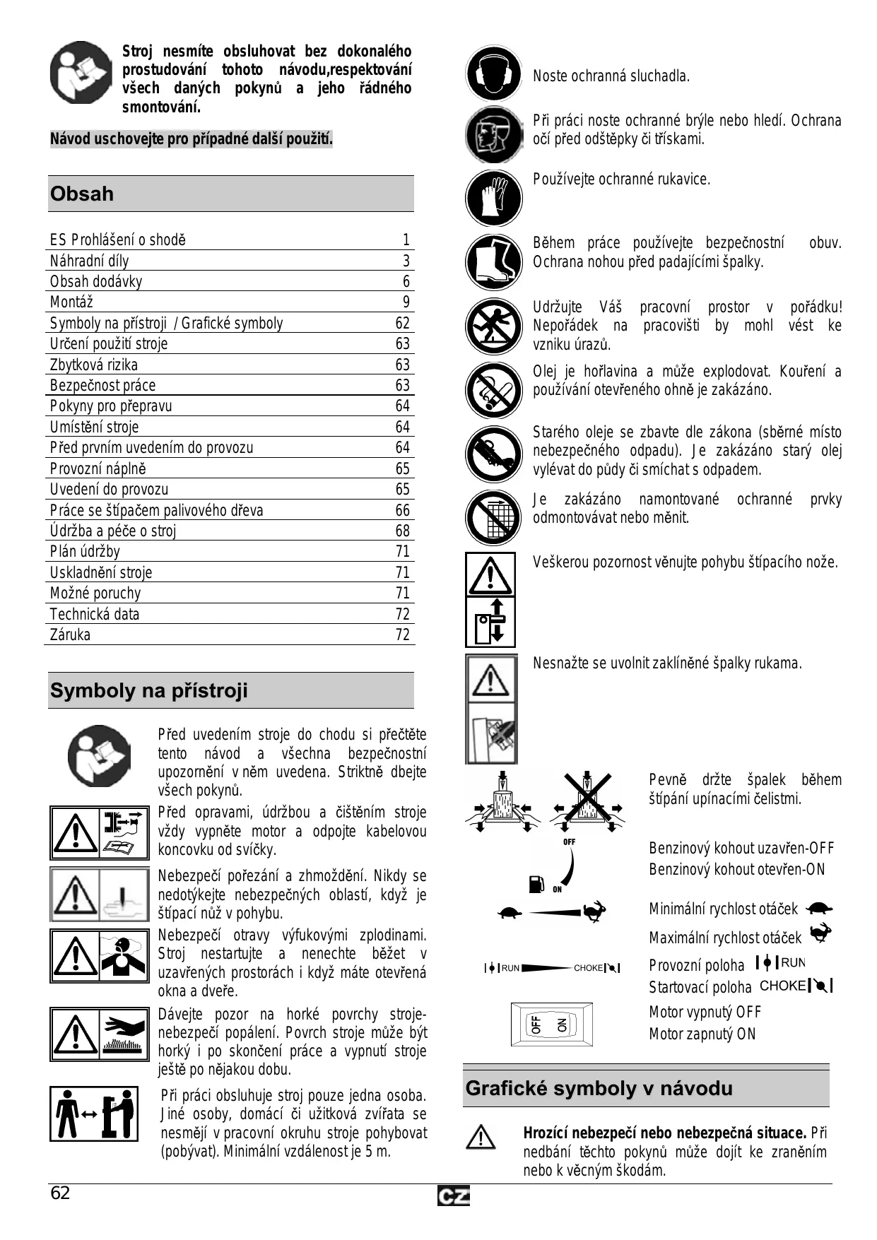 Stroj nesmite obsluhovat bez dokonalého prostudoväni tohoto nävodu,respektoväni véech danÿch pokynü a jeho rédného smontoväni. Nävod uschovejte pro pripadné dali pouziti. Obsah ES ProhléSeni o shodè 1 Néhradhni dily 3 Obsah dodévky 6 Montéz 9 Symboly na pristroji / Grafické symboly 62 Uréeni pouziti stroje 63 Zhytkové rizika 63 Bezpeënost prâce 63 Pokyny pro prepravu 64 Umisténi stroje 64 Pied prvnim uvedenim do provozu 64 Provozni néplnë 65 Uvedeni do provozu 65 Prâce se Stipaëem palivového dreva 66 Üdrzba a péée o stroj 68 Plén üdrzby 71 Uskladnéni stroje 71 Moëné poruchy 71 Technické data 72 Zéruka 72 Symboly na pristroji Pied uvedenim stroje do chodu si preëtète tento névod a véechna bezpeënostni upozoméni vném uvedena. Striktné dbejte v$ech pokynü. EE Pied opravami, Üdrbou à éisténim stroje el vädy vypnète motor a odpojte kabelovou koncovku od sviéky. Nebezpeël porezäni a zhmozdéni. Nikdy se nedotÿkejte nebezpeënÿch oblasti, kdyZ je Stipaci nüz v pohybu. Nebezpeël otravy vÿfukovÿmi zplodinami. Stroj nestartuje a nenechte bézet v uzavrenÿch prostorch i kdyZ mâte otevrené okna à dveïe. Dévejte pozor na horké povrchy stroje-
