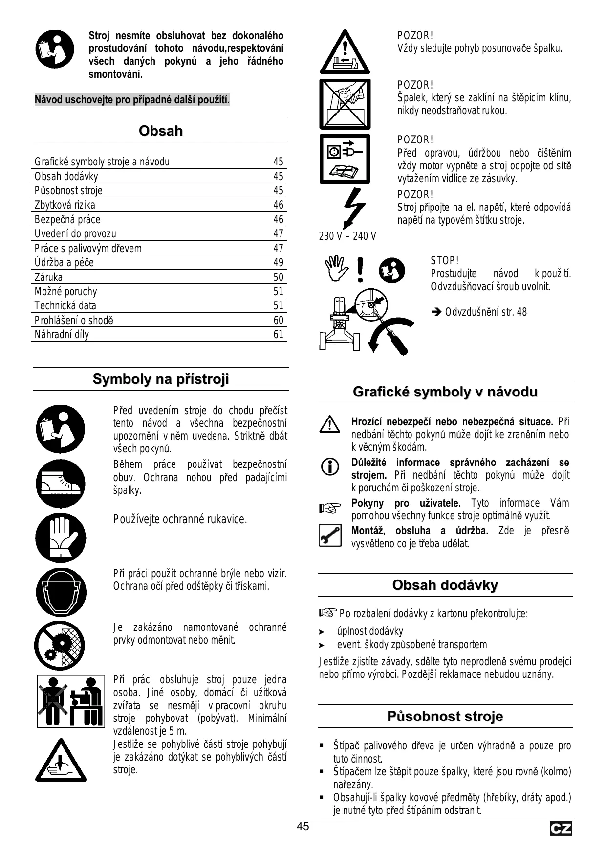 230 V – 240 V STOP! Prostudujte návod k použití. Odvzdušňovací šroub uvolnit. Odvzdušnění str. 48 Symboly na přístroji Grafické symboly v návodu Před uvedením stroje do chodu přečíst tento návod a všechna bezpečnostní upozornění v něm uvedena. Striktně dbát všech pokynů. Během práce používat bezpečnostní obuv. Ochrana nohou před padajícími špalky.