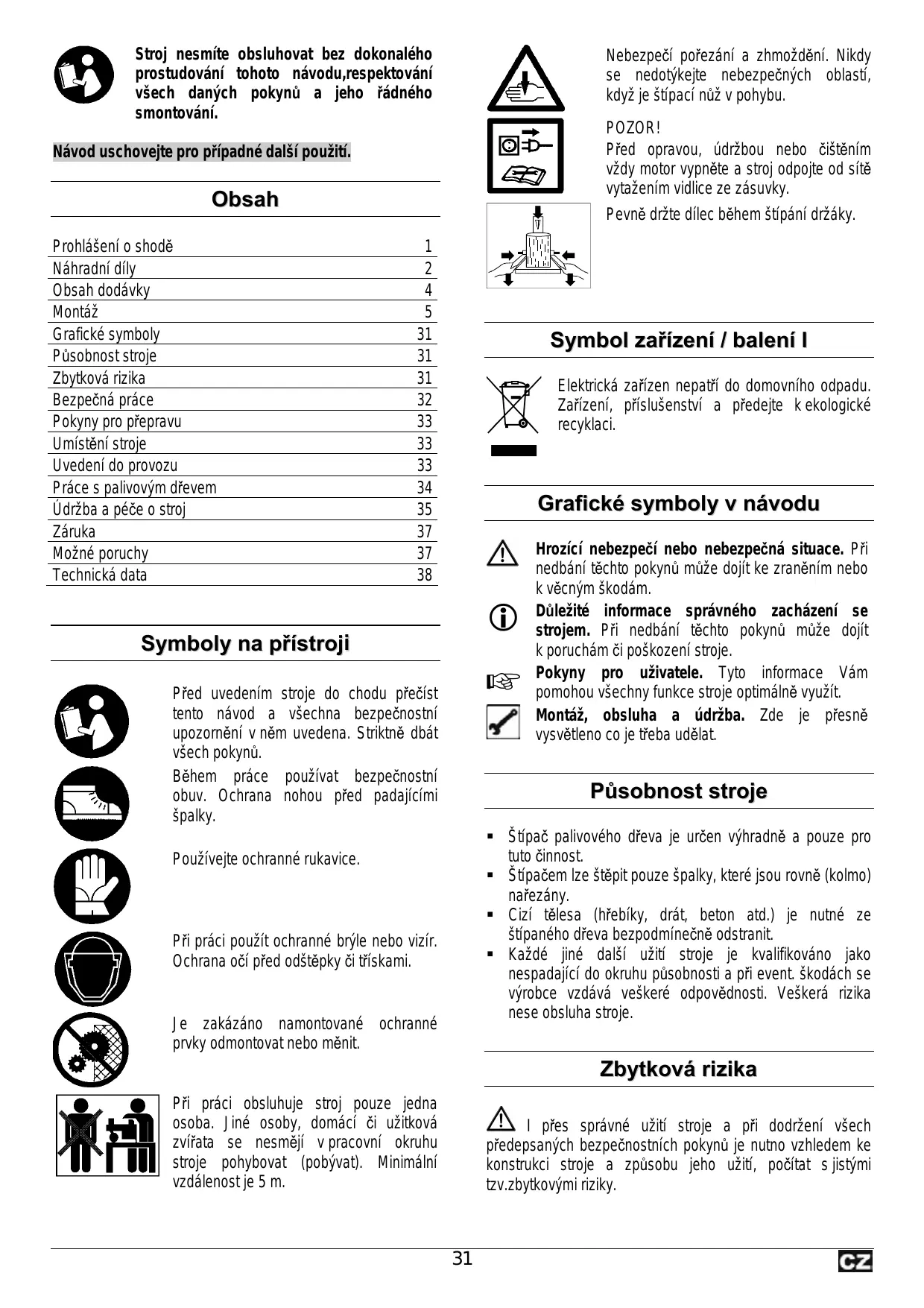 Stroj nesmíte obsluhovat bez dokonalého prostudování tohoto návodu,respektování všech daných pokynů a jeho řádného smontování. Nebezpečí pořezání a zhmoždění. Nikdy se nedotýkejte nebezpečných oblastí, když je štípací nůž v pohybu. POZOR! Před opravou, údržbou nebo čištěním vždy motor vypněte a stroj odpojte od sítě vytažením vidlice ze zásuvky. Návod uschovejte pro případné další použití. Obsah Prohlášení o shodě Náhradní díly Obsah dodávky Montáž Grafické symboly Působnost stroje Zbytková rizika Bezpečná práce Pokyny pro přepravu Umístění stroje Uvedení do provozu Práce s palivovým dřevem Údržba a péče o stroj Záruka Možné poruchy Technická data Pevně držte dílec během štípání držáky.