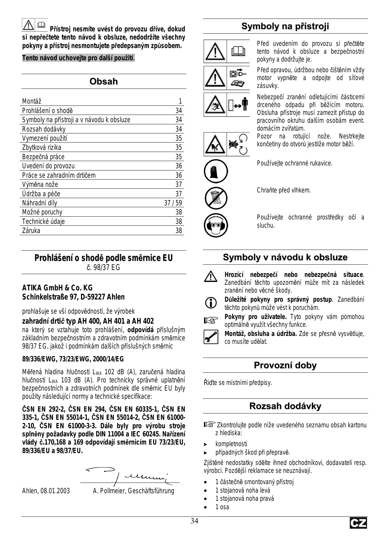 - Prístroj provozujte jen s kompletním a správně namontoványم bezpečnostním zařizením, na stroji neupravujte nic, co by mohlo ohrozit bezpečnost.