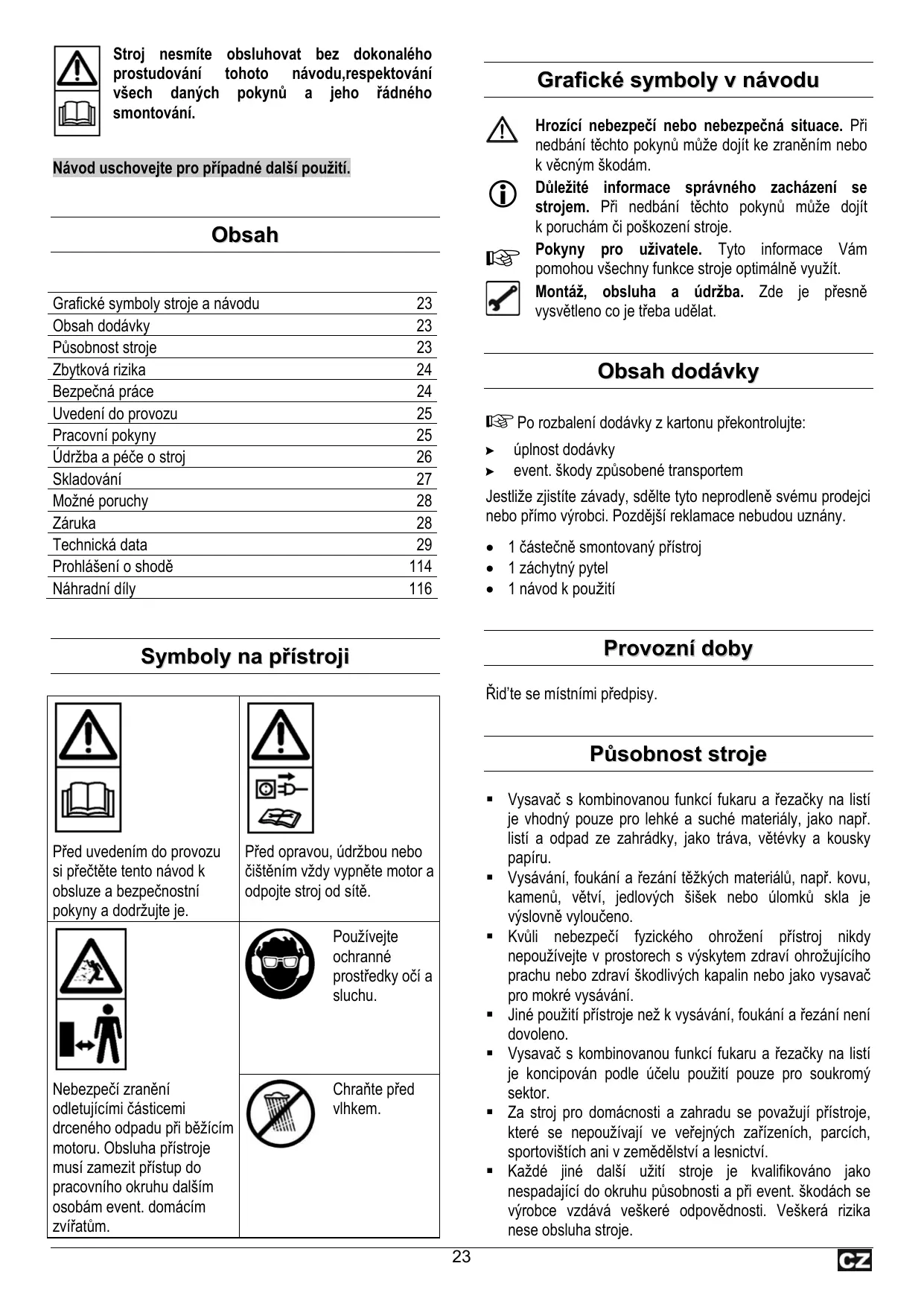 Grafické symboly stroje a návodu Obsah dodávky Působnost stroje Zbytková rizika Bezpečná práce Uvedení do provozu Pracovní pokyny Údržba a péče o stroj Skladování Možné poruchy Záruka Technická data Prohlášení o shodě Náhradní díly