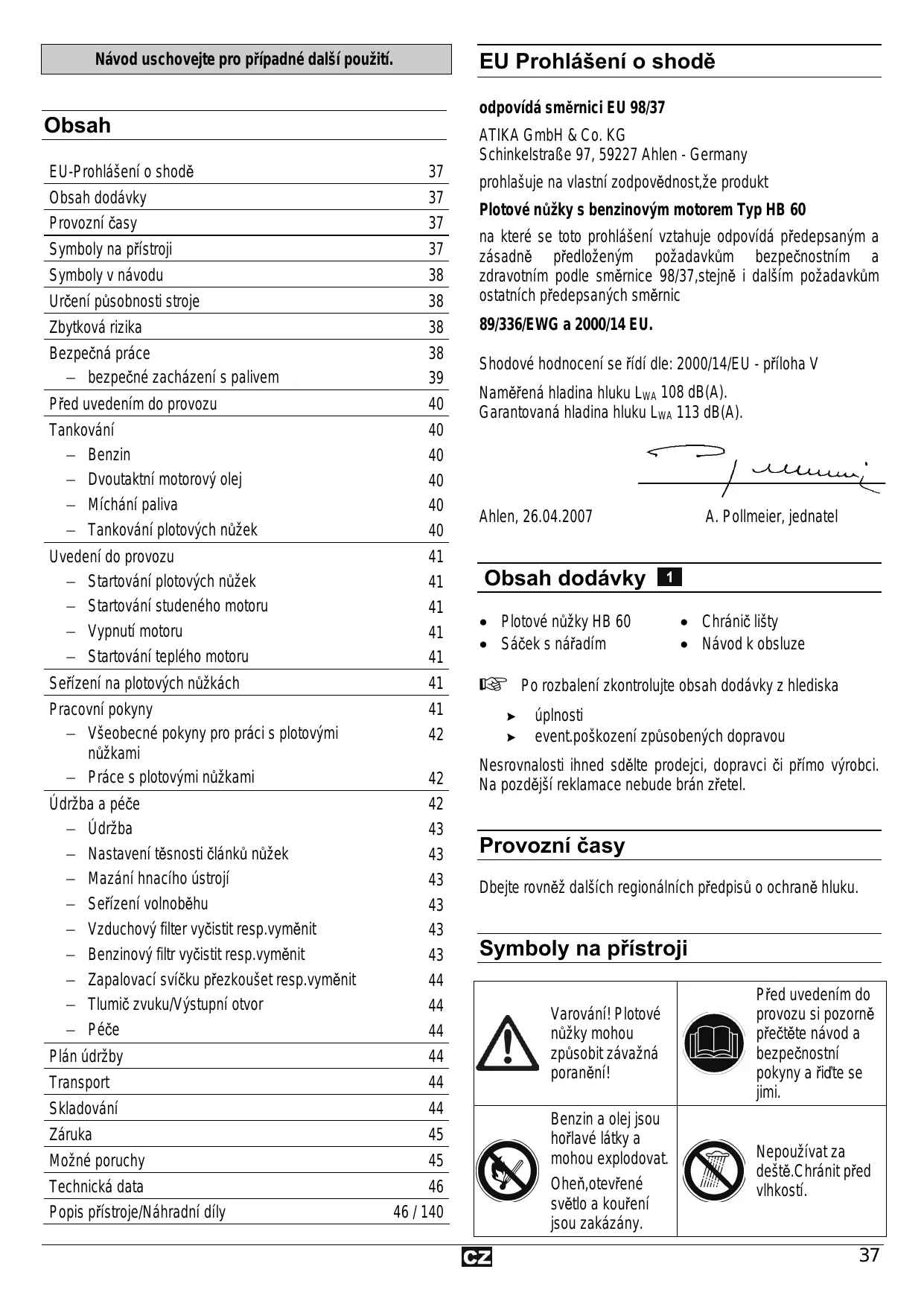 |  Varovány! Plotové nüžky mohou zpúsobit závažná poraněné! |  | Před uvedením do provozu si pozorně prěčěte námod a bezpečnostné poukyny a Žid'te se jimi. |