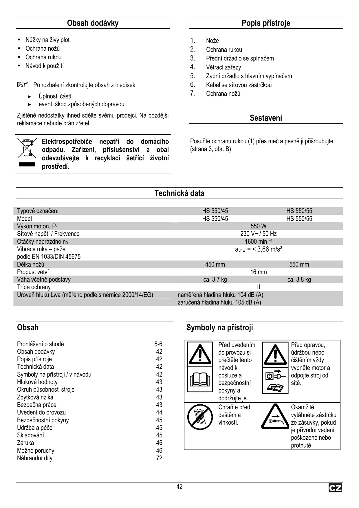 Úplnosti částí event. škod způsobených dopravou Nože Ochrana rukou Přední držadlo se spínačem Větrací zářezy Zadní držadlo s hlavním vypínačem Kabel se síťovou zástrčkou Ochrana nožů Zjištěné nedostatky ihned sdělte svému prodejci. Na pozdější reklamace nebude brán zřetel. Sestavení Elektrospotřebiče nepatří do domácího odpadu. Zařízení, příslušenství a obal odevzdávejte k recyklaci šetřící životní prostředí. Posuňte ochranu rukou (1) přes meč a pevně ji přišroubujte. (strana 3, obr. B) Technická data Typové označení Model Výkon motoru P1 Síťové napětí / Frekvence Otáčky naprázdno n0 Vibrace ruka – paže podle EN 1033/DIN 45675 Délka nožů Propust větví Váha včetně podstavy Třída ochrany Úroveň hluku Lwa (měřeno podle směrnice 2000/14/EG) HS 550/45 HS 550/45 550 W 230 V~ / 50 Hz 1600 min –1 avhw = < 3,66 m/s² 450 mm 550 mm 16 mm ca. 3,7 kg ca. 3,8 kg