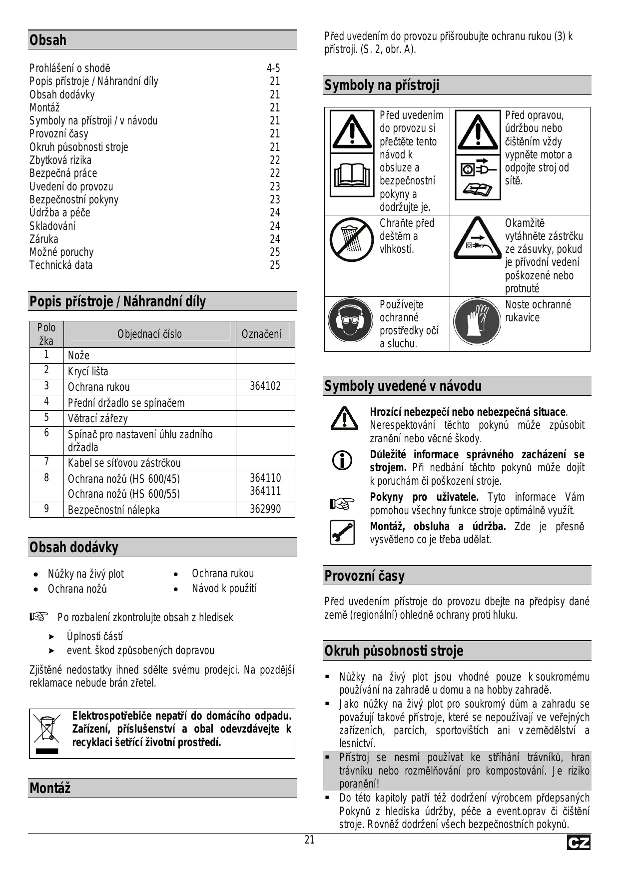 Obsah Prohlášení o shodě Popis přístroje / Náhrandní díly Obsah dodávky Montáž Symboly na přístroji / v návodu Provozní časy Okruh působnosti stroje Zbytková rizika Bezpečná práce Uvedení do provozu Bezpečnostní pokyny Údržba a péče Skladování Záruka Možné poruchy Technická data