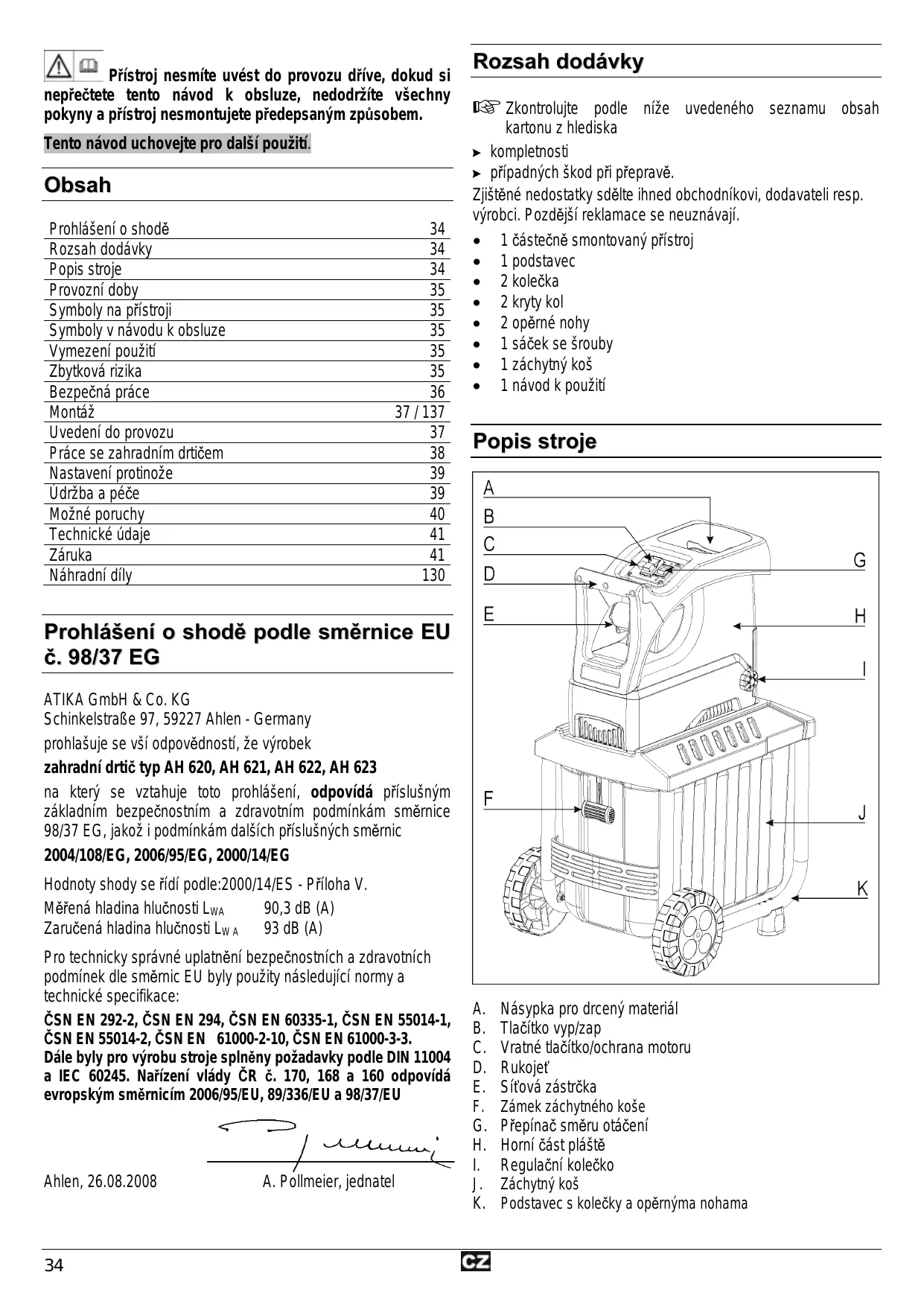 Obsah Ziisténé nedostatky sdëlte ihned obchodnikovi, dodavateli resp. Prohlééent 0 shodë M vÿrobci. Pozdéjsi reklamace se neuznévajf. Rozseh doté ty . % * 1 éésteëné smontovanÿ pristro) Popis stroje 3 * ; pasevec Provozni doby 3 * ; N ee Symboly na pristroji 35 * ryty <o Symboly v nävodu K obsluze 3 * 2 opême nohy Vymezenf pouziti 35 + lsäcekse Srouby Zbytkové rizika 35 + Jzächynÿkos Bezpeëna prâce 36 + 1nävodk pouziti Montéz 371137 Uvedeni do provozu 37 x = Prâce se zahradnim drtiéem 3% Popis stroje Nastaveni protinoze 39 Üdréba a péce 39 A Mozné poruchy 40 B Technické üdaje 41 C Zäruka 41