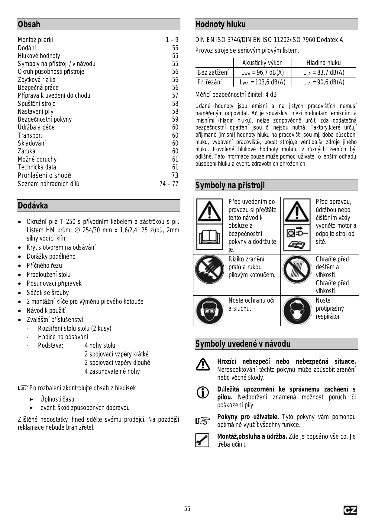 Montaż pilarki Dodání Hlukové hodnoty Symboly na přístroji / v návodu Okruh působnosti přístroje Zbytková rizika Bezpečná práce Příprava k uvedení do chodu Spuštění stroje Nastavení pily Bezpečnostní pokyny Údržba a péče Transport Skladování Záruka Možné poruchy Technická data