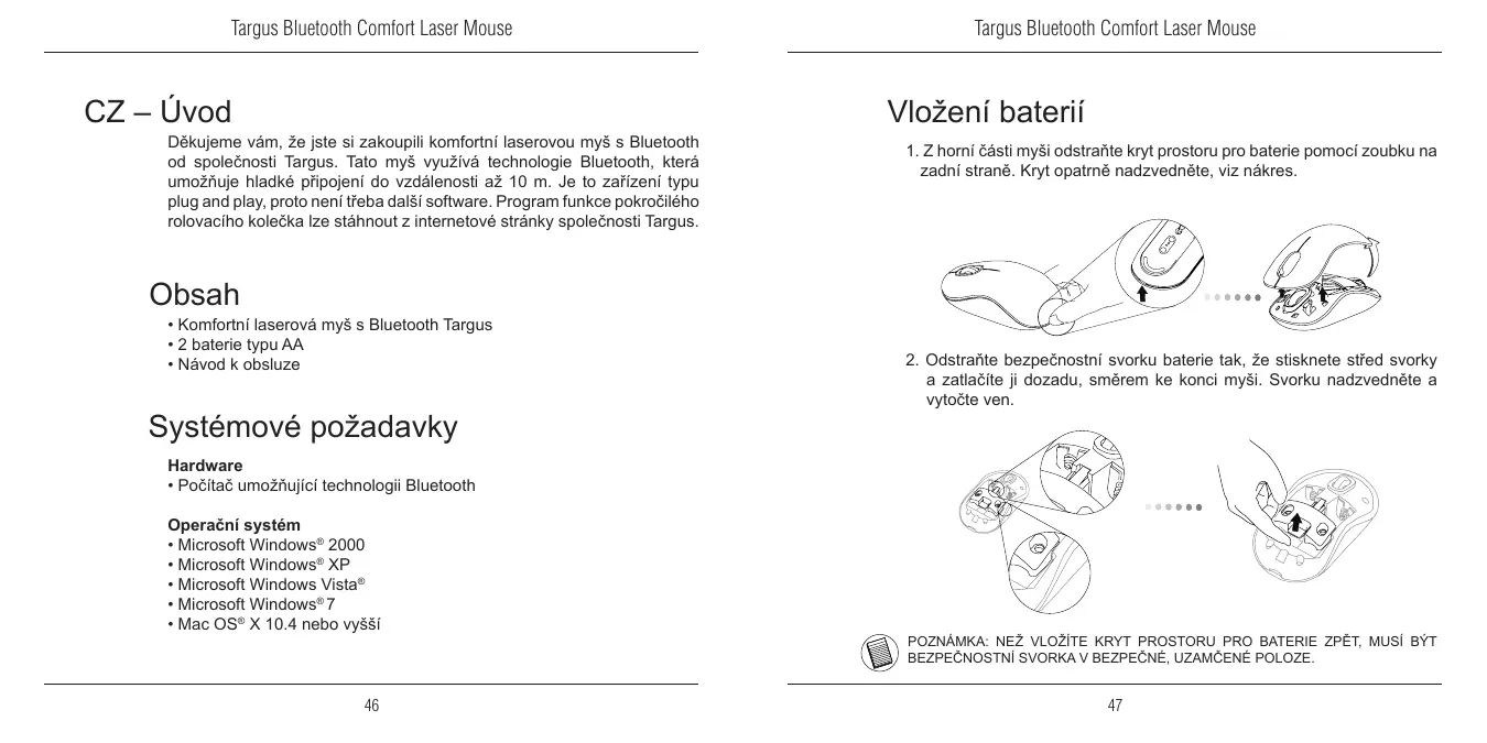 Targus Bluetooth Comfort Laser Mouse CZ – Úvod Děkujeme vám, že jste si zakoupili komfortní laserovou myš s Bluetooth od společnosti Targus. Tato myš využívá technologie Bluetooth, která umožňuje hladké připojení do vzdálenosti až 10 m. Je to zařízení typu plug and play, proto není třeba další software. Program funkce pokročilého rolovacího kolečka lze stáhnout z internetové stránky společnosti Targus. Targus Bluetooth Comfort Laser Mouse Vložení baterií