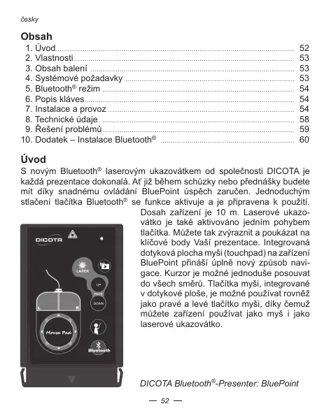 S novym Bluetooth laserovym ukazovatkem od spolecnosti DICOTA je kāzdá prezentace dokonalá. Àj jizhěhem schuzky nebo pfeñdánsky budete mit díky snadnému ovládníe BluePoint uspěch zarčen. Jednoduchym stlačeni tlačitka Bluetooth se funkte aktivujé a je priřavena k použiti.