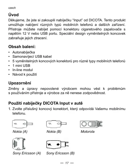 Dekujeme, ze jste si zakoupili nabiješku "Input" od DICOTA. Tento produkt umožnjune nabijeni ruznych typu mobilich Telefonu a dalšich zaflzeni. Přinstroje muzete nabjet pomoci konektoru cigaretového zapalovače s napétim 12 V nebo USB portu. Spezialní design vyměnteních koncovek zabrañuje jejich ztracení.
