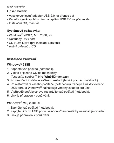 - Po restartovani'vašeho počităće (notebooku), zapojte Link do volného USB portu a Windows® naistulaje vchodný ovláčć pro Link.