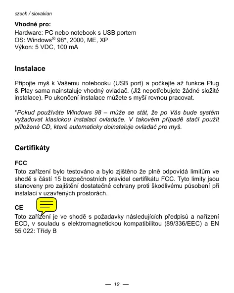 Prijopje myš k Vasemu notebooku (USB port) a počkijež funkće Plug & Play sama nastilanje vchodný ovladć. (Již nepotfebujetežáné složité instalace). Po ukončeni instalace muzěte s myšírovne pracovat.