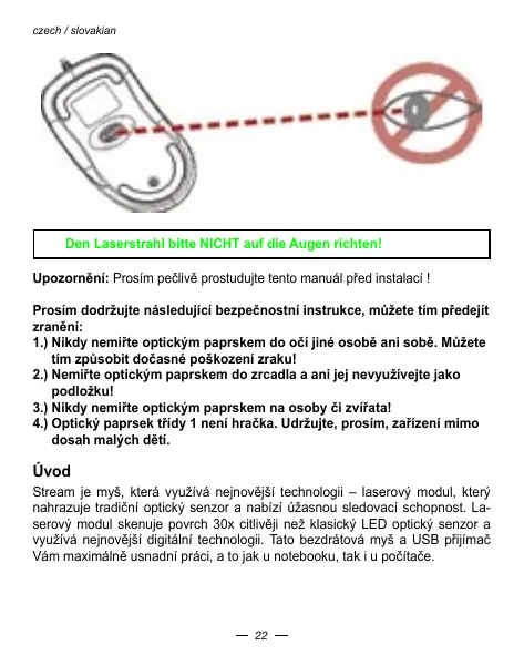 Ppred instalaci mysi Stream vypnete poctac nebo notebook. Zapojovani a hypojovan kabelu mysi muze v pripadé zaputého poctac pe skodit port nebo vaš poctac.