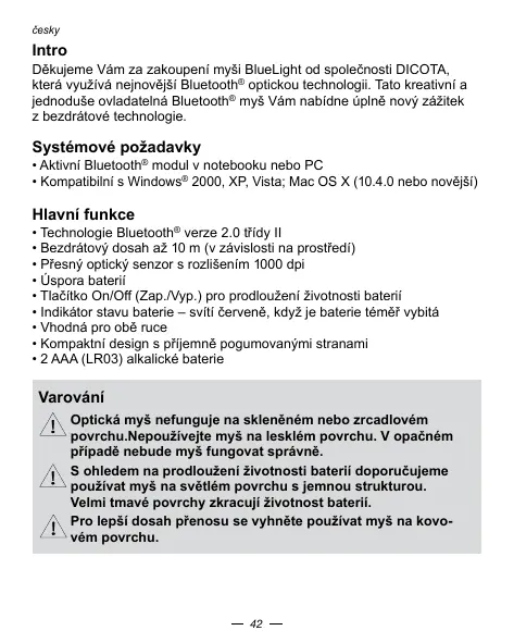Dékujeme Vám za zakopení myssi BlueLight od společnosti DICOTA, která vyžíva nejnovějssi Bluetooth® optickou technologii. Tato kreativné a jednóůte ovladatelna Bluetooth® myssi Vám nabídne uplěnov zážětek z bezdrátóve technologie.