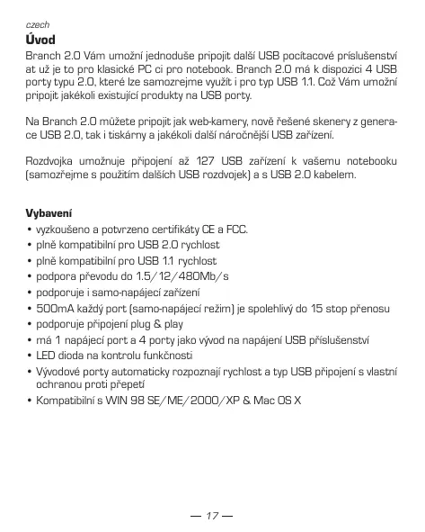 Branch 2.0 Vam umožni Jednoduše pripojt dalsí USB pocitacové príslušenstvi at už je to pro klasické PC ci pro notebook. Branch 2.0 má k dispozici 4 USB porty typu 2.0, které lze samazrejmje vyuzi i pro typ USB 1.1. Což Vam umožni pripojit jakěkolì existujici produktу na USB porty.
