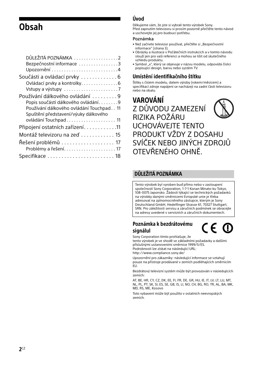 Tento výrobek byl vyroben buď přímo nebo v zastoupení společností Sony Corporation, 1-7-1 Konan Minato-ku Tokyo, 108-0075 Japonsko. Žádosti týkající se technických požadavků na výrobky danými směrnicemi Evropské unie je třeba adresovat na zplnomocněného zástupce, kterým je Sony Deutschland GmbH, Hedelfinger Strasse 61, 70327 Stuttgart, SRN. Pro záležitosti servisu a záručních podmínek se obracejte na adresy uvedené v servisních a záručních dokumentech. Poznámka k bezdrátovému signálul Sony Corporation tímto prohlašuje, že tento výrobek je ve shodě se základními požadavky a dalšími příslušnými ustanoveními směrnice 1999/5/ES. Podrobnosti lze získat na následující URL: http://www.compliance.sony.de/ Upozornění pro zákazníky: následující informace se vztahují pouze na přístroje prodávané v zemích podléhajících směrnicím EU. Bezdrátový televizní systém může být provozován v následujících zemích: AT, BE, HR, CY, CZ, DK, EE, FI, FR, DE, GR, HU, IE, IT, LV, LT, LU, MT, NL, PL, PT, SK, SI, ES, SE, GB, IS, LI, NO, CH, BG, RO, TR, AL, BA, MK, MD, RS, ME, Kosovo Toto vybavení může být použito v ostatních neevropských zemích. 2CZ Instalace na stěně Bezpečnostní informace