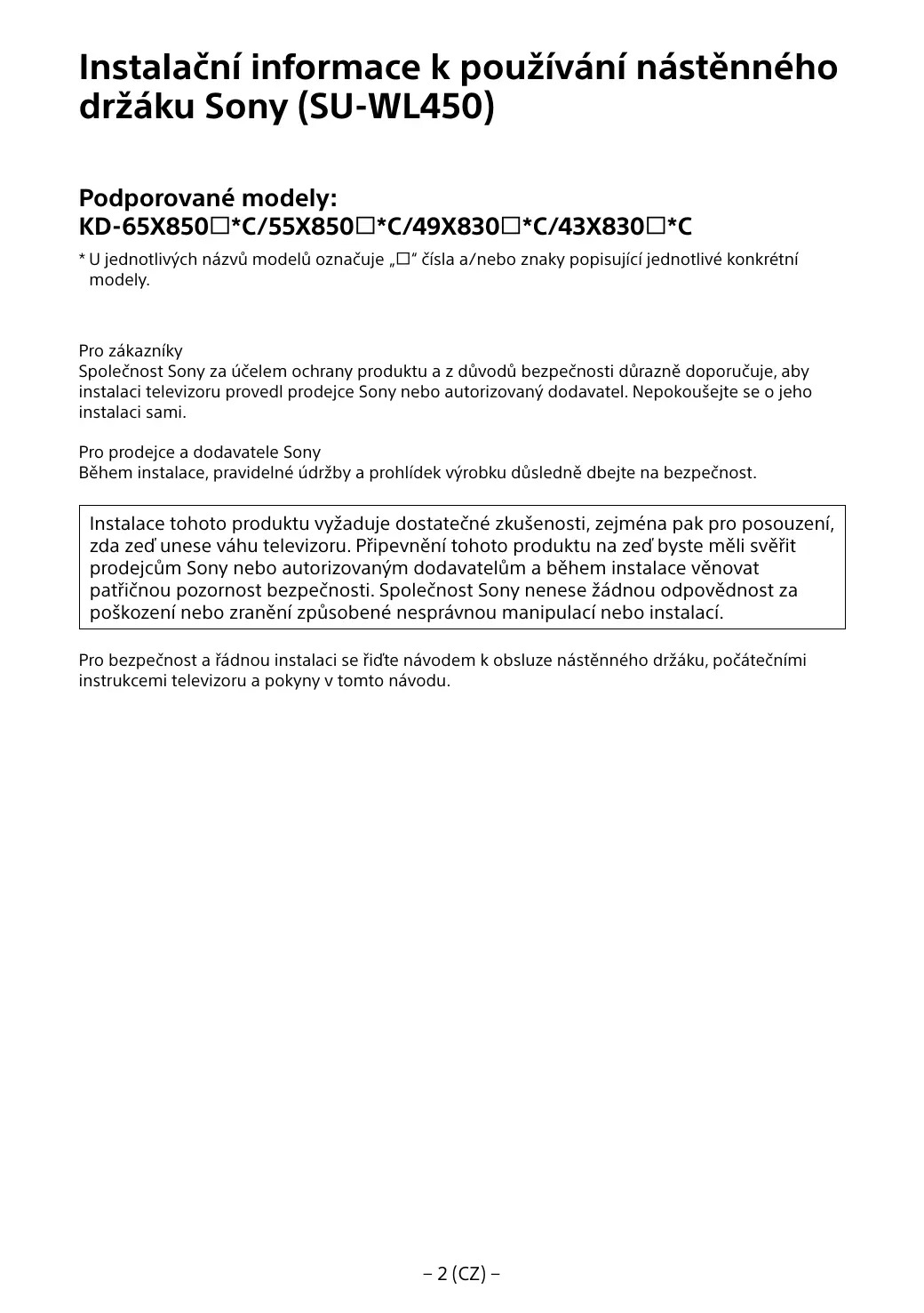 A l’attention des installateurs et revendeurs Sony Soyez particulièrement attentif à la sécurité pendant l’installation, l’entretien périodique et l’examen du produit.