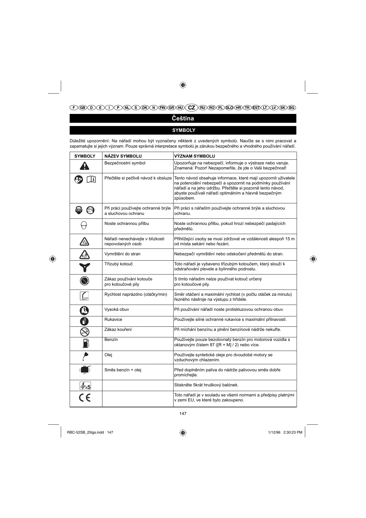 Prohlašujeme na svou odpovědnost, že výrobek, na který se vztahuje toto prohlášení, je v souladu s požadavky bezpečnosti a ochrany zdraví při práci směrnice pro strojní zařízení (98/37/ES) a dalších závazných směrnic, jako např. směrnice 89/336/EHS o elektromagnetické kompatibilitě a směrnic 2000/14/ES (hluk zařízení použitých ve venkovním prostoru) (sbližování právních předpisů týkajících se stanovení hlukových emisí stavebních zařízení a vybavení). Prohlašujeme, že tento výrobek je v souladu s požadavky směrnice 2000/14/ES. 110 dB 115 dB 12 / 2006 Příslušná technická dokumentace je uložena u společnosti Homelite Far East Co., Ltd. 24/F, 388 Castle Peak Road, Tsuen Wan, N. T., Hongkong. Prohlášení o shodě bylo vypracováno v dubnu 2006 společností Homelite Far East Co., Ltd. RBC-52SB_25lgs.indd 277