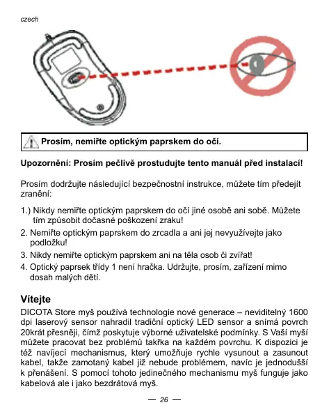 - Tato mys nema Žárdné dalí soucástyk. Použitín jinych dlú ājineho postupu než je uvedeno v manuálu, mžete zpúsobit nebezpeći zraněni.
