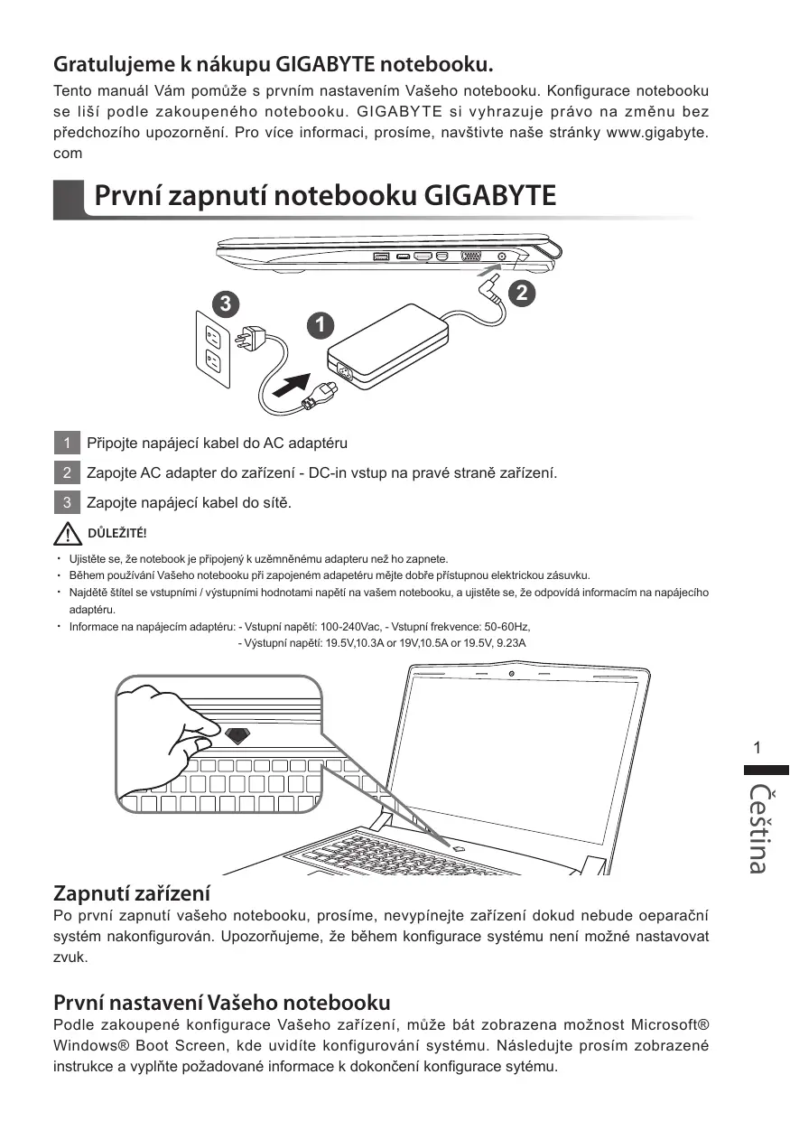 Gratulujeme k nákupu GIGABYTE notebooku. Tento manuál Vám pomůže s prvním nastavením Vašeho notebooku. Konfigurace notebooku se liší podle zakoupeného notebooku. GIGABY TE si v yhrazuje právo na změnu bez předchozího upozornění. Pro více informaci, prosíme, navštivte naše stránky www.gigabyte. com