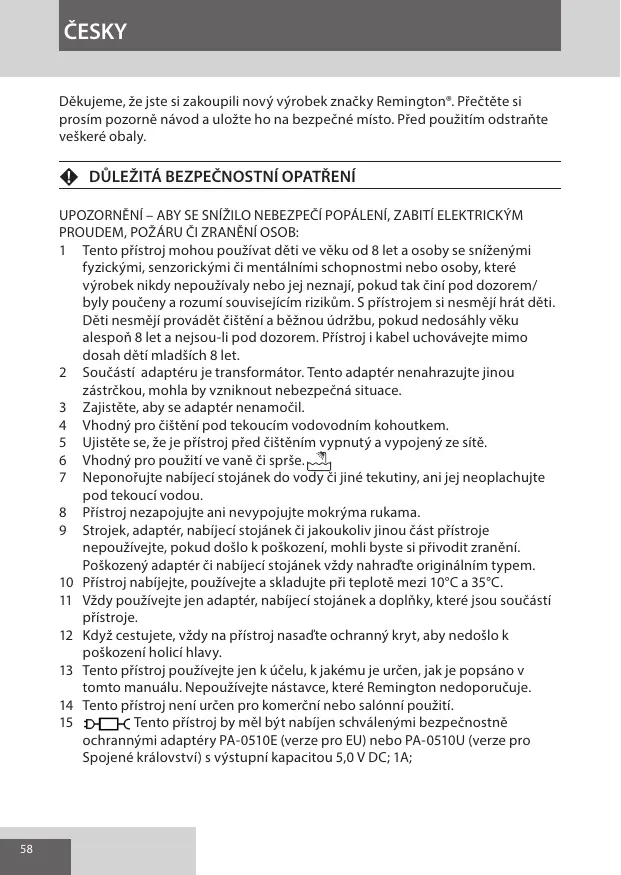 ČESKY Děkujeme, že jste si zakoupili nový výrobek značky Remington®. Přečtěte si prosím pozorně návod a uložte ho na bezpečné místo. Před použitím odstraňte veškeré obaly. F DŮLEŽITÁ BEZPEČNOSTNÍ OPATŘENÍ UPOZORNĚNÍ – ABY SE SNÍŽILO NEBEZPEČÍ POPÁLENÍ, ZABITÍ ELEKTRICKÝM PROUDEM, POŽÁRU ČI ZRANĚNÍ OSOB: 1 Tento přístroj mohou používat děti ve věku od 8 let a osoby se sníženými fyzickými, senzorickými či mentálními schopnostmi nebo osoby, které výrobek nikdy nepoužívaly nebo jej neznají, pokud tak činí pod dozorem/ byly poučeny a rozumí souvisejícím rizikům. S přístrojem si nesmějí hrát děti. Děti nesmějí provádět čištění a běžnou údržbu, pokud nedosáhly věku alespoň 8 let a nejsou-li pod dozorem. Přístroj i kabel uchovávejte mimo dosah dětí mladších 8 let. 2 Součástí adaptéru je transformátor. Tento adaptér nenahrazujte jinou zástrčkou, mohla by vzniknout nebezpečná situace. 3 Zajistěte, aby se adaptér nenamočil. 4 Vhodný pro čištění pod tekoucím vodovodním kohoutkem. 5 Ujistěte se, že je přístroj před čištěním vypnutý a vypojený ze sítě. 6 Vhodný pro použití ve vaně či sprše. 7 Neponořujte nabíjecí stojánek do vody či jiné tekutiny, ani jej neoplachujte pod tekoucí vodou. 8 Přístroj nezapojujte ani nevypojujte mokrýma rukama. 9 Strojek, adaptér, nabíjecí stojánek či jakoukoliv jinou část přístroje nepoužívejte, pokud došlo k poškození, mohli byste si přivodit zranění. Poškozený adaptér či nabíjecí stojánek vždy nahraďte originálním typem. 10 Přístroj nabíjejte, používejte a skladujte při teplotě mezi 10°C a 35°C. 11 Vždy používejte jen adaptér, nabíjecí stojánek a doplňky, které jsou součástí přístroje. 12 Když cestujete, vždy na přístroj nasaďte ochranný kryt, aby nedošlo k poškození holicí hlavy. 13 Tento přístroj používejte jen k účelu, k jakému je určen, jak je popsáno v tomto manuálu. Nepoužívejte nástavce, které Remington nedoporučuje. 14 Tento přístroj není určen pro komerční nebo salónní použití. Tento přístroj by měl být nabíjen schválenými bezpečnostně ochrannými adaptéry PA-0510E (verze pro EU) nebo PA-0510U (verze pro Spojené království) s výstupní kapacitou 5,0 V DC; 1A;