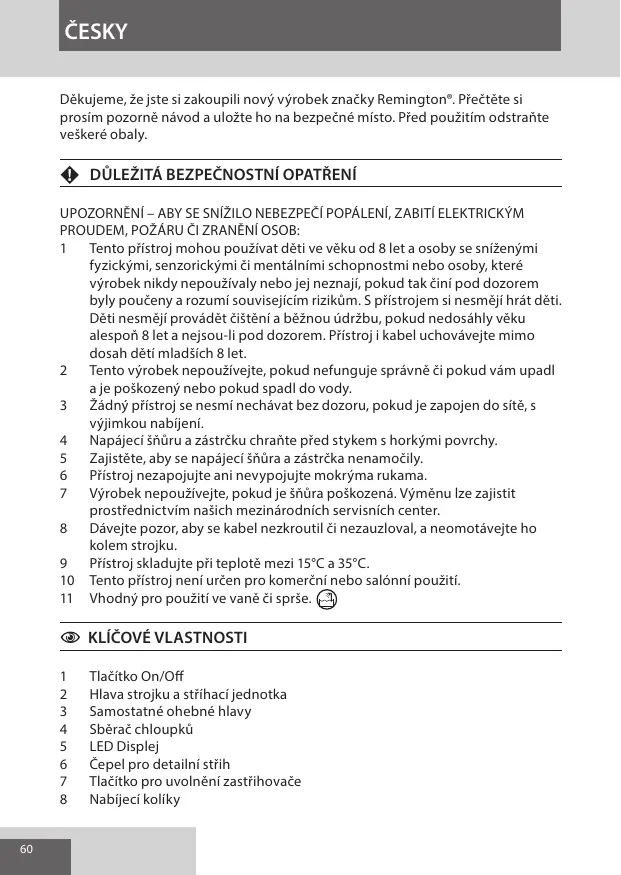 ČESKY Děkujeme, že jste si zakoupili nový výrobek značky Remington®. Přečtěte si prosím pozorně návod a uložte ho na bezpečné místo. Před použitím odstraňte veškeré obaly.