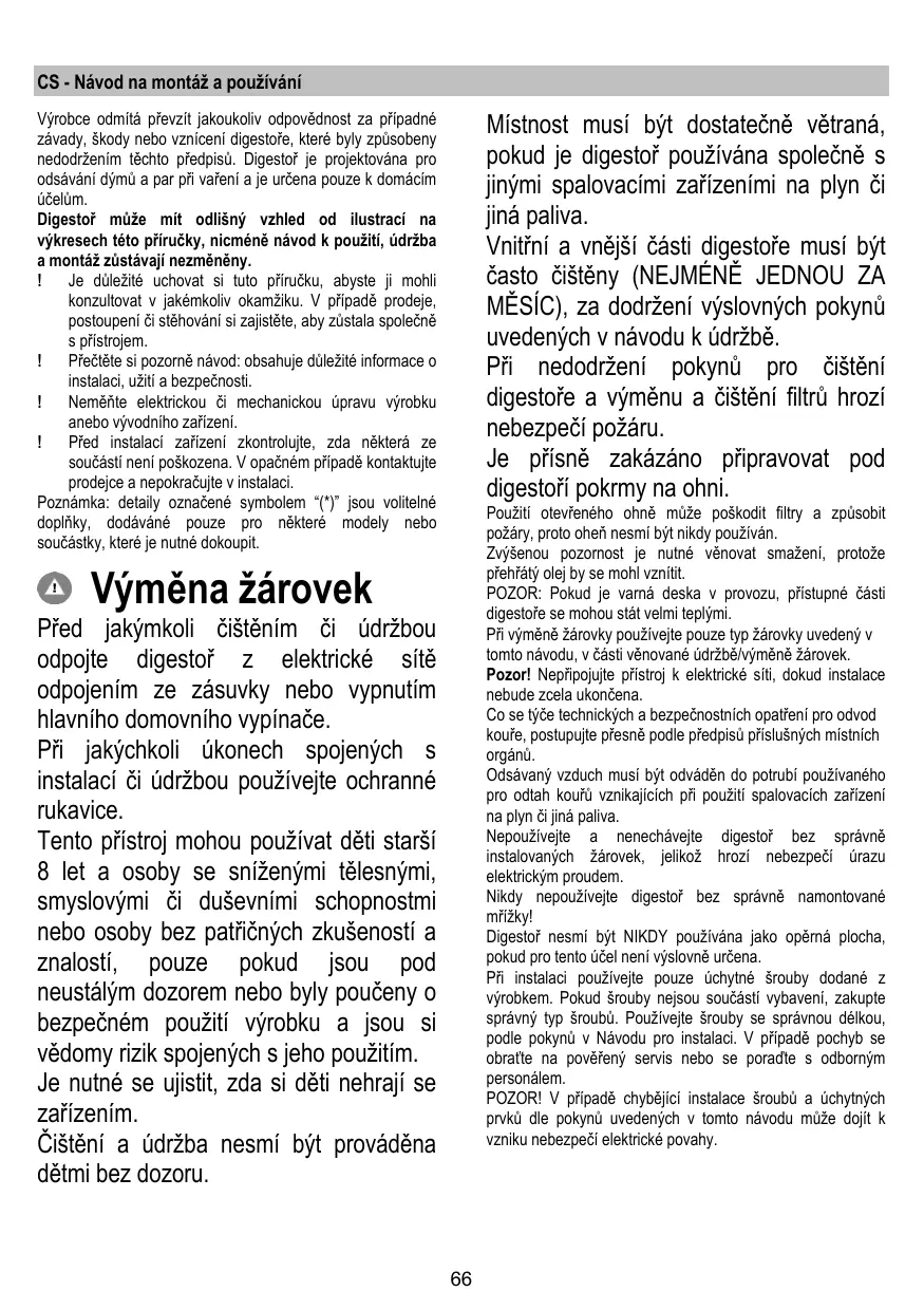 CS - Návod na montáž a používání Výrobce odmítá převzít jakoukoliv odpovědnost za případné závady, škody nebo vznícení digestoře, které byly způsobeny nedodržením těchto předpisů. Digestoř je projektována pro odsávání dýmů a par při vaření a je určena pouze k domácím účelům. Digestoř může mít odlišný vzhled od ilustrací na výkresech této příručky, nicméně návod k použití, údržba a montáž zůstávají nezměněny. Je důležité uchovat si tuto příručku, abyste ji mohli konzultovat v jakémkoliv okamžiku. V případě prodeje, postoupení či stěhování si zajistěte, aby zůstala společně s přístrojem. Přečtěte si pozorně návod: obsahuje důležité informace o instalaci, užití a bezpečnosti. Neměňte elektrickou či mechanickou úpravu výrobku anebo vývodního zařízení. Před instalací zařízení zkontrolujte, zda některá ze součástí není poškozena. V opačném případě kontaktujte prodejce a nepokračujte v instalaci. Poznámka: detaily označené symbolem “(*)” jsou volitelné doplňky, dodáváné pouze pro některé modely nebo součástky, které je nutné dokoupit. Místnost musí být dostatečně větraná, pokud je digestoř používána společně s jinými spalovacími zařízeními na plyn či jiná paliva. Vnitřní a vnější části digestoře musí být často čištěny (NEJMÉNĚ JEDNOU ZA MĚSÍC), za dodržení výslovných pokynů uvedených v návodu k údržbě. Při nedodržení pokynů pro čištění digestoře a výměnu a čištění filtrů hrozí nebezpečí požáru. Je přísně zakázáno připravovat pod digestoří pokrmy na ohni. Použití otevřeného ohně může poškodit filtry a způsobit požáry, proto oheň nesmí být nikdy používán. Zvýšenou pozornost je nutné věnovat smažení, protože přehřátý olej by se mohl vznítit. POZOR: Pokud je varná deska v provozu, přístupné části digestoře se mohou stát velmi teplými. Při výměně žárovky používejte pouze typ žárovky uvedený v tomto návodu, v části věnované údržbě/výměně žárovek. Pozor! Nepřipojujte přístroj k elektrické síti, dokud instalace nebude zcela ukončena. Co se týče technických a bezpečnostních opatření pro odvod kouře, postupujte přesně podle předpisů příslušných místních orgánů. Odsávaný vzduch musí být odváděn do potrubí používaného pro odtah kouřů vznikajících při použití spalovacích zařízení na plyn či jiná paliva. Nepoužívejte a nenechávejte digestoř bez správně instalovaných žárovek, jelikož hrozí nebezpečí úrazu elektrickým proudem. Nikdy nepoužívejte digestoř bez správně namontované mřížky! Digestoř nesmí být NIKDY používána jako opěrná plocha, pokud pro tento účel není výslovně určena. Při instalaci používejte pouze úchytné šrouby dodané z výrobkem. Pokud šrouby nejsou součástí vybavení, zakupte správný typ šroubů. Používejte šrouby se správnou délkou, podle pokynů v Návodu pro instalaci. V případě pochyb se obraťte na pověřený servis nebo se poraďte s odborným personálem. POZOR! V případě chybějící instalace šroubů a úchytných prvků dle pokynů uvedených v tomto návodu může dojít k vzniku nebezpečí elektrické povahy. Výměna žárovek Před jakýmkoli čištěním či údržbou odpojte digestoř z elektrické sítě odpojením ze zásuvky nebo vypnutím hlavního domovního vypínače. Při jakýchkoli úkonech spojených s instalací či údržbou používejte ochranné rukavice. Tento přístroj mohou používat děti starší 8 let a osoby se sníženými tělesnými, smyslovými či duševními schopnostmi nebo osoby bez patřičných zkušeností a znalostí, pouze pokud jsou pod neustálým dozorem nebo byly poučeny o bezpečném použití výrobku a jsou si vědomy rizik spojených s jeho použitím. Je nutné se ujistit, zda si děti nehrají se zařízením. Čištění a údržba nesmí být prováděna dětmi bez dozoru.