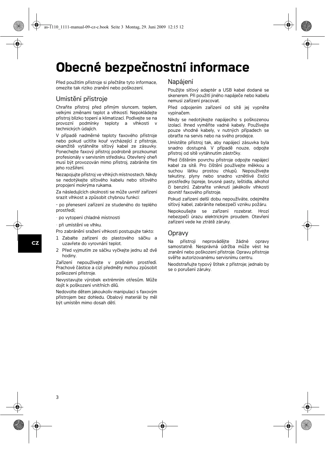 as-1110_1111-manual-09-cz-c.book Seite 3 Montag, 29. Juni 2009 12:15 12 Obecné bezpečnostní informace Obecné bezpečnostní informace Před použitím přístroje si přečtěte tyto informace, omezíte tak riziko zranění nebo poškození. Umístění přístroje Chraňte přístroj před přímým sluncem Chraňte přístroj před přímým sluncem, teplem, velkými změnami teplot a vlhkostí. Nepokládejte přístroj blízko topení a klimatizací. Podívejte se na provozní podmínky teploty a vlhkosti v technických údajích. V případě nadměrné teploty faxového přístroje nebo pokud ucítíte kouř vycházející z přístroje V případě nadměrné teploty faxového přístroje nebo pokud ucítíte kouř vycházející z přístroje, okamžitě vytáhněte síťový kabel ze zásuvky. Ponechejte faxový přístroj podrobně prozkoumat profesionály v servisním středisku. Otevřený oheň musí být provozován mimo přístroj, zabráníte tím jeho rozšíření. Nezapojujte přístroj ve vlhkých místnostech. Nezapojujte přístroj ve vlhkých místnostech. Nikdy se nedotýkejte síťového kabelu nebo síťového propojení mokrýma rukama. Sražení vlhkosti Za následujících okolnosti se může uvnitř zařízení srazit vlhkost a způsobit chybnou funkci: - po přenesení zařízení ze studeného do teplého prostředí;
