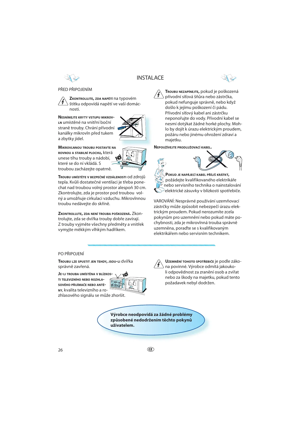 TROUBU LZE SPUSTIT JEN TEHDY, JSOU-LI dvířka správně zavřená. UZEMNĚNÍ TOHOTO SPOTŘEBIČE je podle zákona povinné. Výrobce odmítá jakoukoli odpovědnost za zranění osob a zvířat nebo za škody na majetku, pokud tento požadavek nebyl dodržen. JE-LI TROUBA UMÍSTĚNA V BLÍZKOSTI TELEVIZNÍHO NEBO ROZHLASOVÉHO PŘIJÍMAČE NEBO ANTÉNY, kvalita televizního a rozhlasového signálu se může zhoršit. Výrobce neodpovídá za žádné problémy způsobené nedodržením těchto pokynů uživatelem.