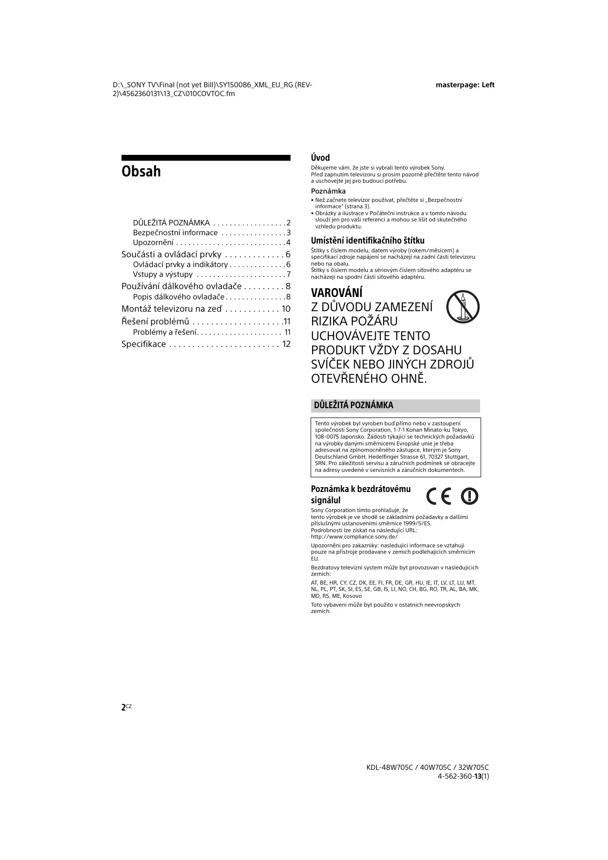 Bezpeënostni informace Upozornéni .…............. Soutästi a ovlädaci prvky … Ovlédaci prvky a indikätory .… Vstupy a vÿstupy ........... Pouñiväni délkového ovladate Popis dälkového ovladaée. Montäz televizoru na zed .. Reëeni problémü Problémy a feëeni..….............. Specifikace ........................ masterpage: Left Uvod Dékujeme vém, e jse si wybrali tento vÿrobek Sony. Pred zapnutim televizoru si prosim pezarné preëtéte tento névod à uschovejt jej pro budouci potrebu Poznämka + Neë zaënete televizor pouñivat, pfeétête si .Bezpeënostni informace” (strana 3) + Obrézky a ilustrace v Potäteéni instrukce a v tomto névodu slouëi jen pro vaëi referenci a mohou se it od skuteëného vzhledu produktu. Umisténi identifikaëniho Stitku Sttky s dslem modelu, date wÿroby {rokem/mésicem) a specifkaci zdroje napäjeni se nachäzeji na zadni éasti televizoru nebo na obalu Sttky s dslem modelu a sériowÿm islem sitového adaptéru se nachézej na spodni st sifového adaptéru VAROVANI