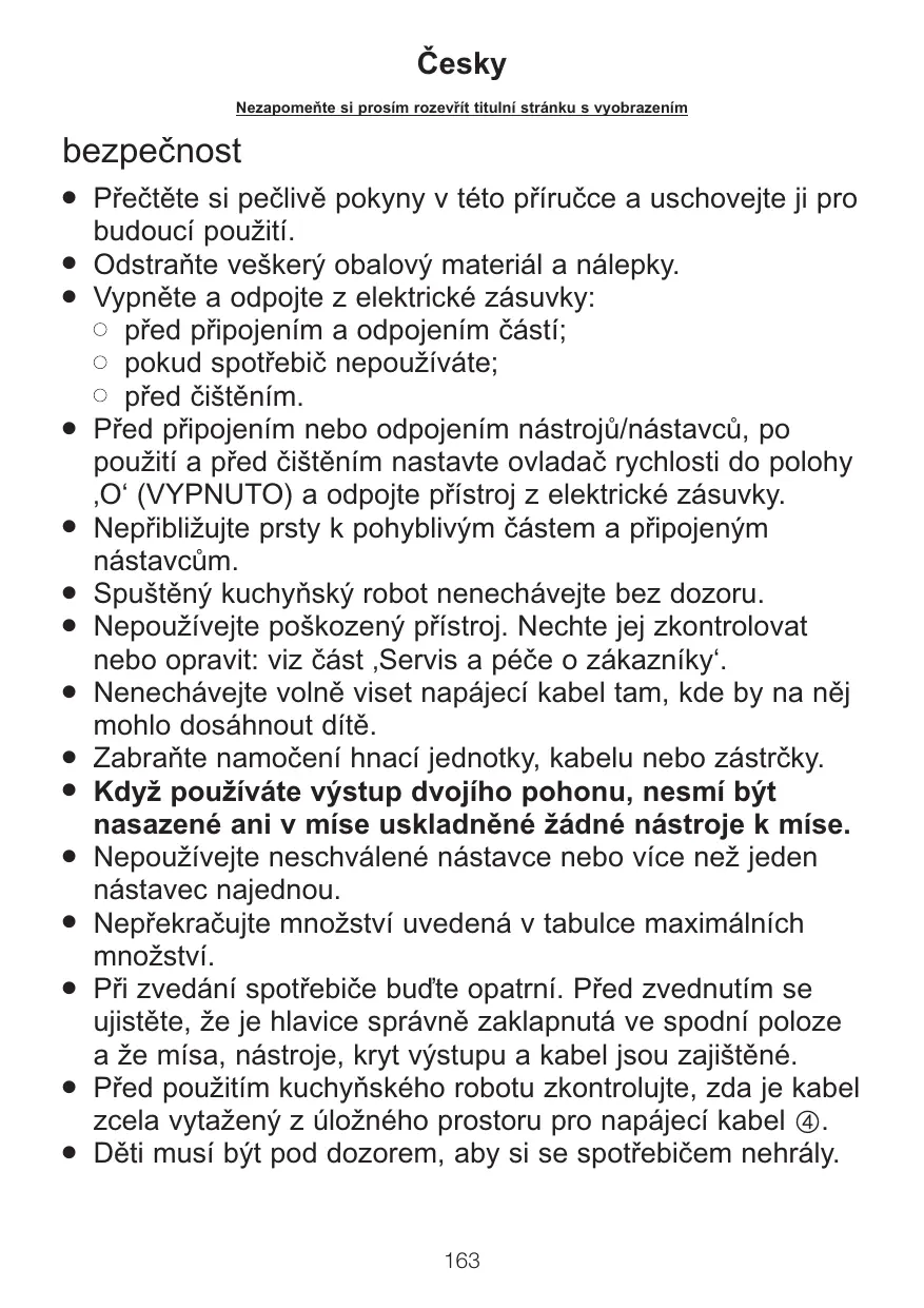 Přečtěte si pečlivě pokyny v této příručce a uschovejte ji pro budoucí použití. Odstraňte veškerý obalový materiál a nálepky. Vypněte a odpojte z elektrické zásuvky: l před připojením a odpojením částí; l pokud spotřebič nepoužíváte; l před čištěním. Před připojením nebo odpojením nástrojů/nástavců, po použití a před čištěním nastavte ovladač rychlosti do polohy ‚O‘ (VYPNUTO) a odpojte přístroj z elektrické zásuvky. Nepřibližujte prsty k pohyblivým částem a připojeným nástavcům. Spuštěný kuchyňský robot nenechávejte bez dozoru. Nepoužívejte poškozený přístroj. Nechte jej zkontrolovat nebo opravit: viz část ‚Servis a péče o zákazníky‘. Nenechávejte volně viset napájecí kabel tam, kde by na něj mohlo dosáhnout dítě. Zabraňte namočení hnací jednotky, kabelu nebo zástrčky. Když používáte výstup dvojího pohonu, nesmí být nasazené ani v míse uskladněné žádné nástroje k míse. Nepoužívejte neschválené nástavce nebo více než jeden nástavec najednou. Nepřekračujte množství uvedená v tabulce maximálních množství. Při zvedání spotřebiče buďte opatrní. Před zvednutím se ujistěte, že je hlavice správně zaklapnutá ve spodní poloze a že mísa, nástroje, kryt výstupu a kabel jsou zajištěné. Před použitím kuchyňského robotu zkontrolujte, zda je kabel zcela vytažený z úložného prostoru pro napájecí kabel 4. Děti musí být pod dozorem, aby si se spotřebičem nehrály.