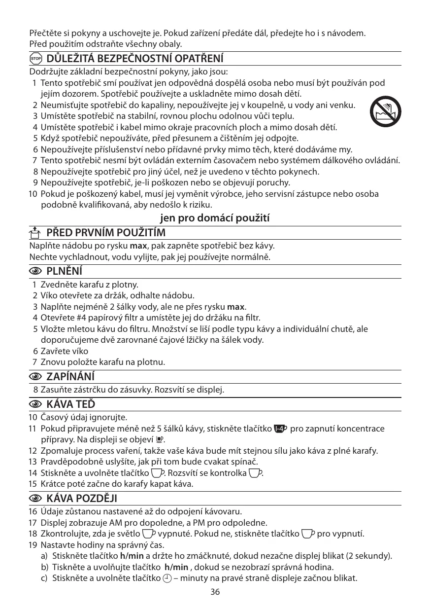 C PLOTNA 27 Na plotně zůstane káva teplá 2 hodiny. 28 Během této doby bude na displeji blikat X. 29 Po dvou hodinách se ohřev zcela zastaví. 30 Pro ruční vypnutí přístroje stiskněte tlačítko X. 31 Pokud ji tam necháte déle než hodinu, chemické změny v kávě začnou ovlivňovat chuť. Nejlepší je kávu odlít a uvařit čerstvou konvici.
