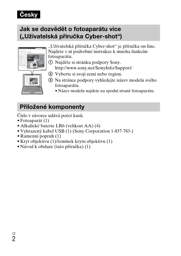 Česky Jak se dozvědět o fotoaparátu více („Uživatelská příručka Cyber-shot“) „Uživatelská příručka Cyber-shot“ je příručka on-line. Najdete v ní podrobné instrukce k mnoha funkcím fotoaparátu. 1 Najděte si stránku podpory Sony. http://www.sony.net/SonyInfo/Support/ 2 Vyberte si svoji zemi nebo region. 3 Na stránce podpory vyhledejte název modelu svého fotoaparátu. • Název modelu najdete na spodní straně fotoaparátu.