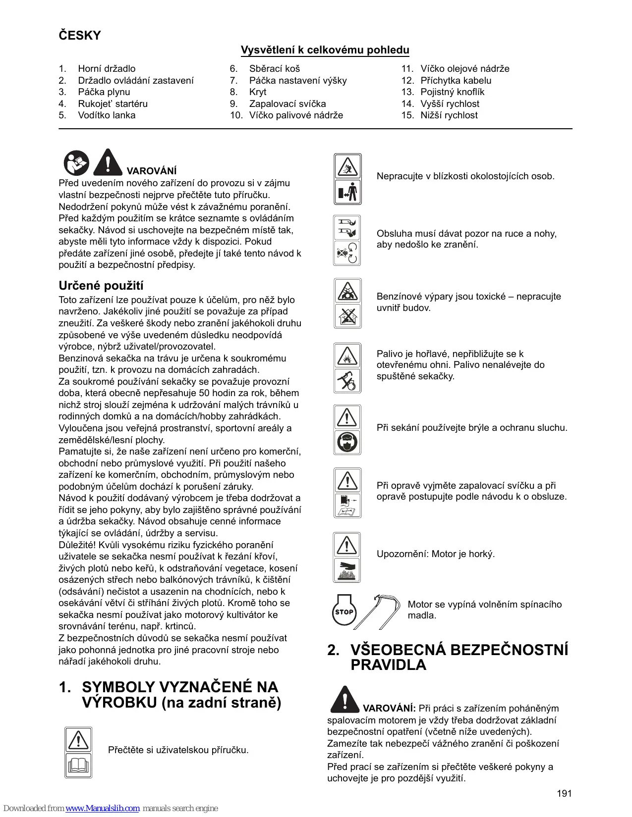 2. VŠEOBECNÁ BEZPEČNOSTNÍ PRAVIDLA VAROVÁNÍ: Při práci s zařízením poháněným spalovacím motorem je vždy třeba dodržovat základní bezpečnostní opatření (včetně níže uvedených). Zamezíte tak nebezpečí vážného zranění či poškození zařízení. Před prací se zařízením si přečtěte veškeré pokyny a uchovejte je pro pozdější využití. 191