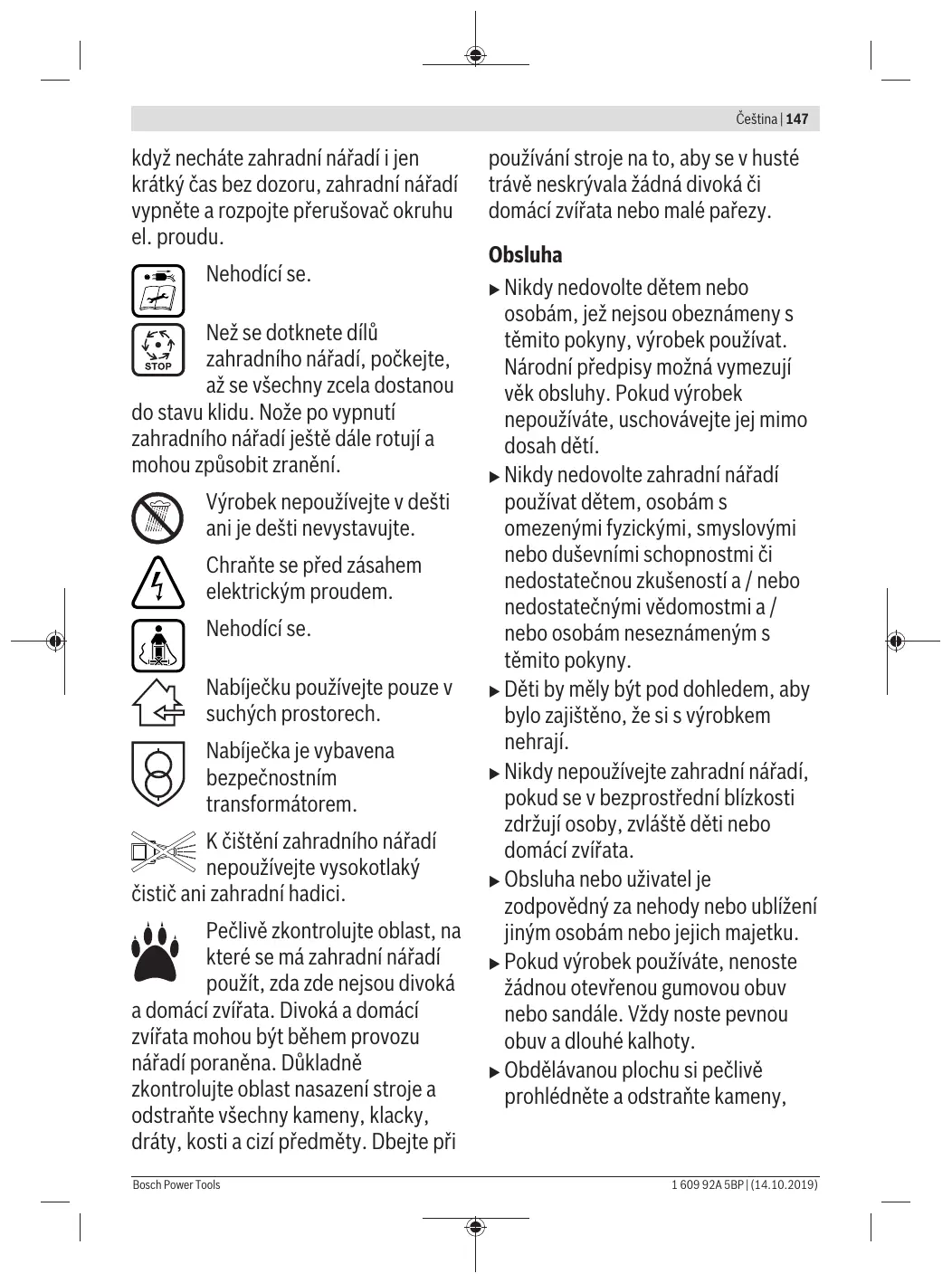 Bosch Power Tools – Narzędzie ogrodowe oraz akumulator należy przechowywać w zakresie temperatur pomiędzy 20 °C i 50 °C. Akumulatora nie należy na przykład pozostawiać latem w samochodzie. – Akumulator należy przechowywać oddzielnie. Nie przechowywać narzędzia ogrodowego z osadzonym akumulatorem. – Jeżeli narzędzie ogrodowe poddane jest bezpośrednim promieniom słońca, nie należy pozostawiać w nim akumulatora. – Optymalna temperatura przechowywania akumulatora wynosi 5 C. – Otwory wentylacyjne należy regularnie czyścić za pomocą miękkiego, czystego i suchego pędzelka. 1 609 92A 5BP | (14.10.2019) 146 | Čeština Wyraźnie skrócony czas użytkowania akumulatora po naładowaniu świadczy o tym, że akumulator jest zużyty i trzeba go wymienić. żyte akumulatory/baterie, należy zbierać osobno i doprowadzić do ponownego przetworzenia zgodnego z zasadami ochrony środowiska. Obsługa klienta oraz doradztwo dotyczące użytkowania Akumulatory/Baterie: www.bosch-garden.com Przy wszystkich zgłoszeniach oraz zamówieniach części zamiennych konieczne jest podanie 10‑cyfrowego numeru katalogowego, znajdującego się na tabliczce znamionowej produktu. Polska Robert Bosch Sp. z o.o. Serwis Elektronarzędzi Ul. Jutrzenki 102/104 02-230 Warszawa Na www.serwisbosch.com znajdą Państwo wszystkie szczegóły dotyczące usług serwisowych online. Tel.: 22 7154450 Faks: 22 7154440 E-Mail: bsc@pl.bosch.com www.bosch-pt.pl Transport Załączone w dostawie akumulatory litowo jonowe podlegają wymaganiom przepisów dotyczących towarów niebezpiecznych. Akumulatory mogą być transportowane drogą lądową przez użytkownika bez konieczności spełnienia jakichkolwiek dalszych warunków. W przypadku przesyłki przez osoby trzecie (np. transport drogą powietrzną lub za pośrednictwem firmy spedycyjnej) należy dostosować się do szczególnych wymogów dotyczących opakowania i znaczenia towaru. W takim wypadku podczas przygotowywania towaru do wysyłki należy skonsultować się z ekspertem d/s towarów niebezpiecznych. Akumulatory można wysyłać tylko wówczas, gdy ich obudowa nie jest uszkodzona. Odsłonięte styki należy zakleić, a akumulator zapakować w taki sposób, aby nie mógł on się poruszać (przesuwać) w opakowaniu. Należy wziąć też pod uwagę ewentualne przepisy prawa krajowego. Usuwanie odpadów Narzędzia ogrodowe, akumulatory, osprzęt i opakowanie należy oddać do powtórnego przetworzenia zgodnego z obowiązującymi przepisami w zakresie ochrony środowiska. Narzędzi ogrodowych, a także akumulatorów/ baterii nie wolno wyrzucać do odpadów z gospodarstwa domowego! Tylko dla państw należących do UE: Zgodnie z europejską wytyczną 2012/19/UE, niezdatne do użytku elektronarzędzia i urządzenia elektroniczne, a zgodnie z europejską wytyczną 2006/66/WE uszkodzone lub zu1 609 92A 5BP | (14.10.2019) Li-Ion: Prosimy postępować zgodnie ze wskazówkami umieszczonymi w rozdziale Transport. Čeština Bezpečnostní upozornění Výstraha! Pročtěte si pozorně následující pokyny. Seznamte se s obslužnými prvky a řádným používáním výrobku. Uschovejte si prosím pečlivě návod k použití pro pozdější potřebu. Vysvětlivky symbolů na zahradním nářadí, nabíječce a akumulátoru Všeobecné upozornění na nebezpečí. Pročtěte si návod k použití. Dbejte na to, aby nebyly v blízkosti stojící osoby zraněny odletujícími cizími tělesy. Varování: Pokud výrobek pracuje, udržujte vůči němu bezpečný odstup. Pozor: Nedotýkejte se rotujících nožů. Nože jsou ostré. Chraňte se před ztrátou prstů na nohou a rukou. Před prováděním prací údržby nebo čištění nebo Bosch Power Tools Čeština | 147 když necháte zahradní nářadí i jen krátký čas bez dozoru, zahradní nářadí vypněte a rozpojte přerušovač okruhu el. proudu. Nehodící se. Než se dotknete dílů zahradního nářadí, počkejte, až se všechny zcela dostanou do stavu klidu. Nože po vypnutí zahradního nářadí ještě dále rotují a mohou způsobit zranění. Výrobek nepoužívejte v dešti ani je dešti nevystavujte. Chraňte se před zásahem elektrickým proudem. Nehodící se. Nabíječku používejte pouze v suchých prostorech. Nabíječka je vybavena bezpečnostním transformátorem. K čištění zahradního nářadí nepoužívejte vysokotlaký čistič ani zahradní hadici. Pečlivě zkontrolujte oblast, na které se má zahradní nářadí použít, zda zde nejsou divoká a domácí zvířata. Divoká a domácí zvířata mohou být během provozu nářadí poraněna. Důkladně zkontrolujte oblast nasazení stroje a odstraňte všechny kameny, klacky, dráty, kosti a cizí předměty. Dbejte při Bosch Power Tools používání stroje na to, aby se v husté trávě neskrývala žádná divoká či domácí zvířata nebo malé pařezy. Obsluha u Nikdy nedovolte dětem nebo osobám, jež nejsou obeznámeny s těmito pokyny, výrobek používat. Národní předpisy možná vymezují věk obsluhy. Pokud výrobek nepoužíváte, uschovávejte jej mimo dosah dětí. u Nikdy nedovolte zahradní nářadí používat dětem, osobám s omezenými fyzickými, smyslovými nebo duševními schopnostmi či nedostatečnou zkušeností a / nebo nedostatečnými vědomostmi a / nebo osobám neseznámeným s těmito pokyny. u Děti by měly být pod dohledem, aby bylo zajištěno, že si s výrobkem nehrají. u Nikdy nepoužívejte zahradní nářadí, pokud se v bezprostřední blízkosti zdržují osoby, zvláště děti nebo domácí zvířata. u Obsluha nebo uživatel je zodpovědný za nehody nebo ublížení jiným osobám nebo jejich majetku. u Pokud výrobek používáte, nenoste žádnou otevřenou gumovou obuv nebo sandále. Vždy noste pevnou obuv a dlouhé kalhoty. u Obdělávanou plochu si pečlivě prohlédněte a odstraňte kameny, 1 609 92A 5BP | (14.10.2019) 148 | Čeština klacky, dráty,