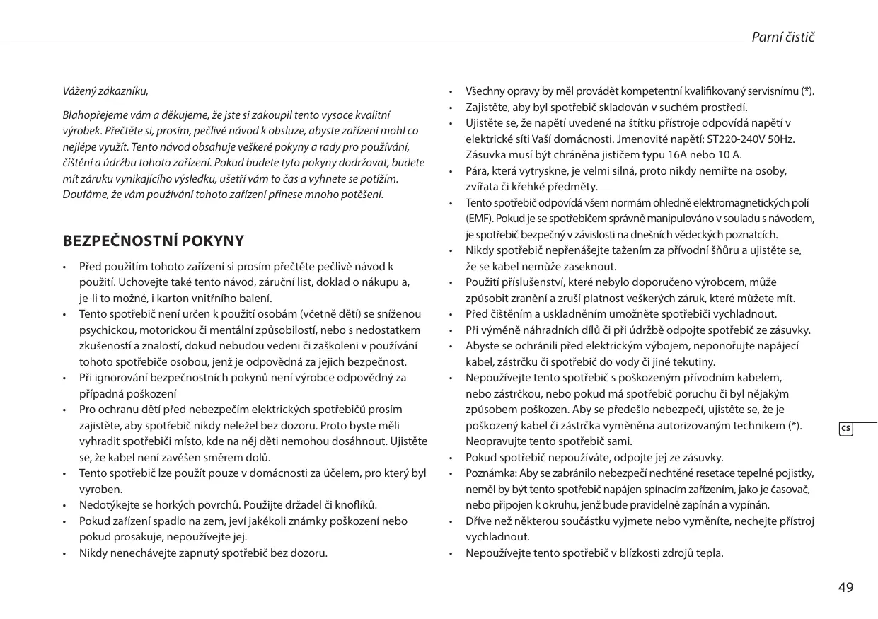 - Před použitím si prosím prěčěte pečlivé námod k použítí. Parní Čisticí lze použít pouze v domácnosti.