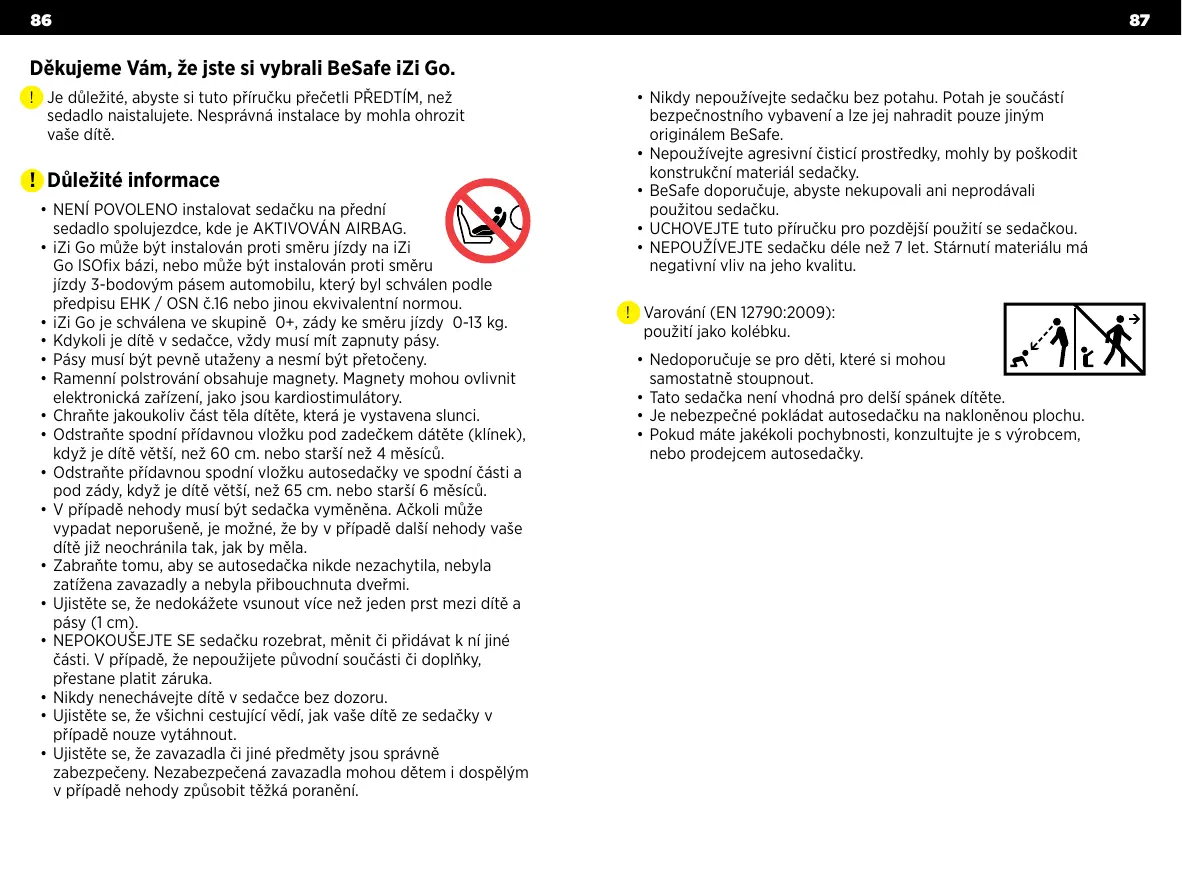 • Nikdy nepoužívejte sedačku bez potahu. Potah je součástí bezpečnostního vybavení a lze jej nahradit pouze jiným originálem BeSafe. • Nepoužívejte agresivní čisticí prostředky, mohly by poškodit konstrukční materiál sedačky. • BeSafe doporučuje, abyste nekupovali ani neprodávali použitou sedačku. • UCHOVEJTE tuto příručku pro pozdější použití se sedačkou. • NEPOUŽÍVEJTE sedačku déle než 7 let. Stárnutí materiálu má negativní vliv na jeho kvalitu. !! Varování (EN 12790:2009): použití jako kolébku. • Nedoporučuje se pro děti, které si mohou samostatně stoupnout. • Tato sedačka není vhodná pro delší spánek dítěte. • Je nebezpečné pokládat autosedačku na nakloněnou plochu. • Pokud máte jakékoli pochybnosti, konzultujte je s výrobcem, nebo prodejcem autosedačky.
