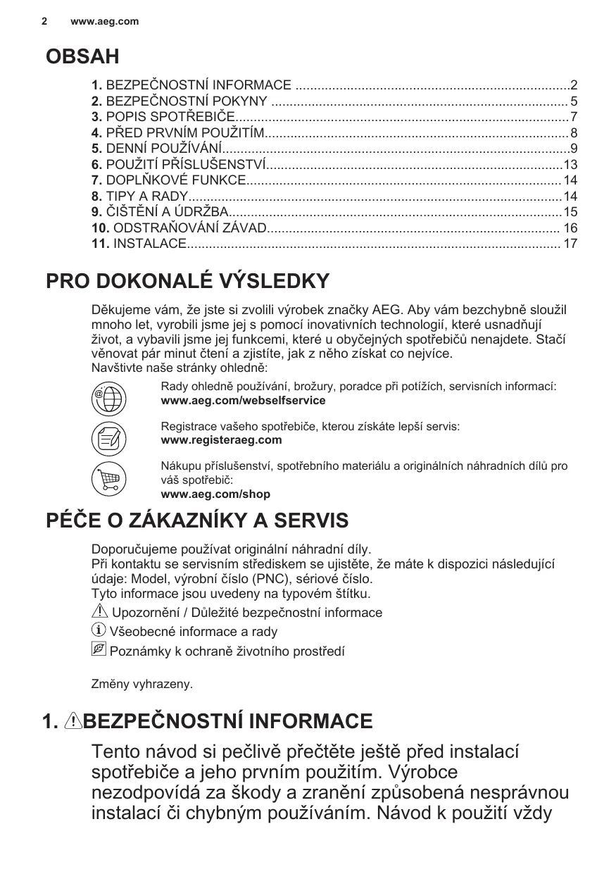 Děkujeme vám, že jste si zvolili výrobek značky AEG. Aby vám bezchybně sloužil mnoho let, vyrobili jsme jej s pomocí inovativních technologií, které usnadňují život, a vybavili jsme jej funkcemi, které u obyčejných spotřebičů nenajdete. Stačí věnovat pár minut čtení a zjistíte, jak z něho získat co nejvíce. Navštivte naše stránky ohledně: Rady ohledně používání, brožury, poradce při potížích, servisních informací: www.aeg.com/webselfservice Registrace vašeho spotřebiče, kterou získáte lepší servis: www.registeraeg.com Nákupu příslušenství, spotřebního materiálu a originálních náhradních dílů pro váš spotřebič: www.aeg.com/shop PÉČE O ZÁKAZNÍKY A SERVIS Doporučujeme používat originální náhradní díly. Při kontaktu se servisním střediskem se ujistěte, že máte k dispozici následující údaje: Model, výrobní číslo (PNC), sériové číslo. Tyto informace jsou uvedeny na typovém štítku. Upozornění / Důležité bezpečnostní informace Všeobecné informace a rady Poznámky k ochraně životního prostředí Zmĕny vyhrazeny.