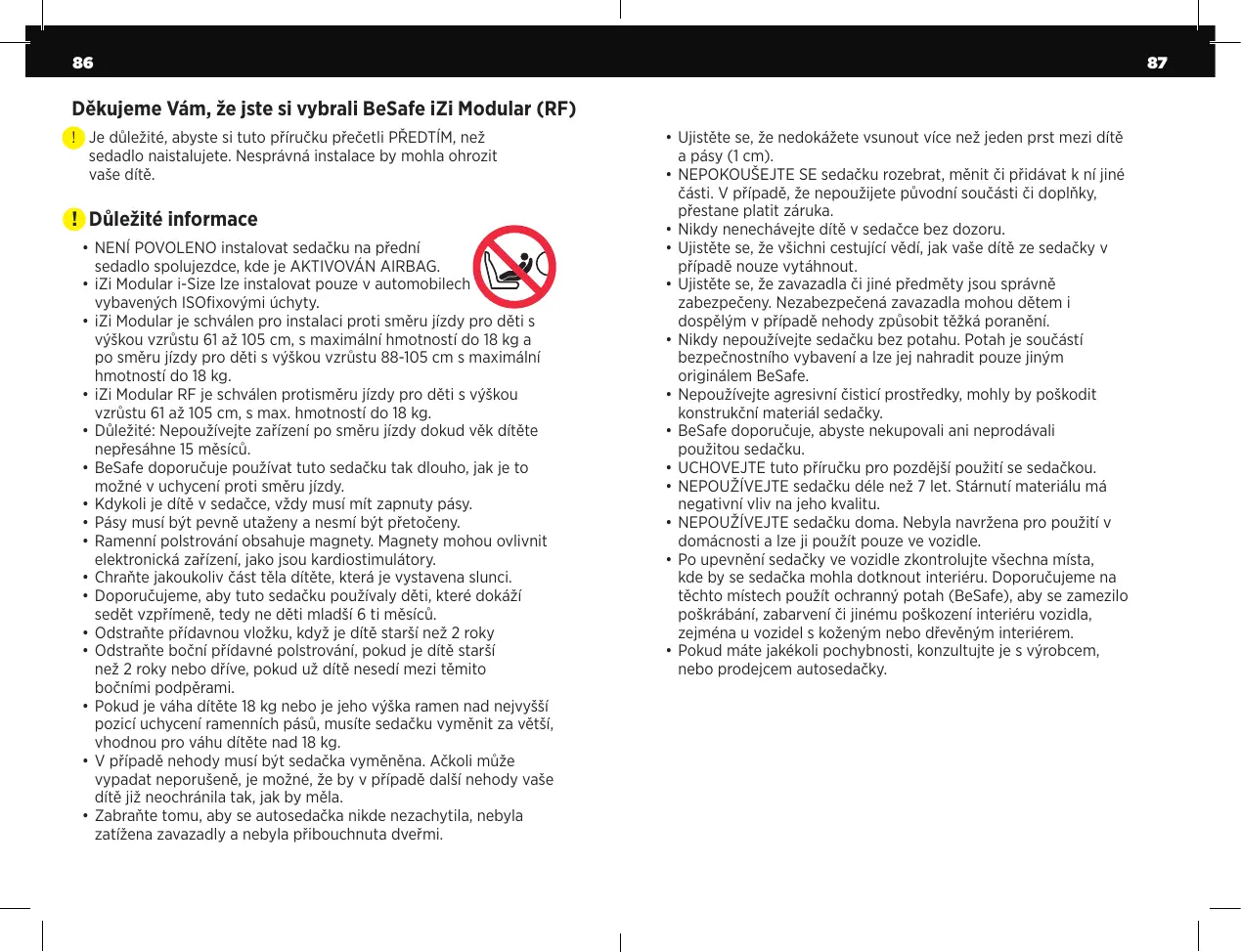 • Il est INTERDIT d’installer le siège sur un siège avant AVEC UN AIRBAG ACTIVÉ. • iZi Modular ne peut être installé que sur la base iZi Modular i-Size. • iZi Modular est approuvé Dos Route pour des enfants mesurant de 61 à 105 cm et pesant au maximum 18 kg et Face Route pour des enfants mesurant de 88 à 105 cm et pesant au maximum 18kg. • iZi Modular RF( Dos Route) est approuvé pour des enfants mesurant de 61 à 105 cm, pesant au maximum 18kg. • Important:ne pas utiliser Face Route avant les 15 mois de l’enfant. • BeSafe recommande d’utliser le siège Dos Route aussi longtemps que possible. • Les sangles du harnais doivent toujours être attachées lorsque l’enfant est dans le siège. • Les sangles du harnais doivent être bien serrées sans être tordues. • Les protections d’épaule contiennent des aimants. Les aimants peuvent avoir une influence sur les équipements électroniques tels que les pacemakers. • Protéger toutes les parties de l’enfant exposées au soleil. • Nous vous conseillons d’utiliser ce siège uniquement pour des enfants qui peuvent se tenir assis, soit pas avant l’âge de 6 mois. • Retirer le coussin réducteur lorsque l’enfant a passé 2 ans. • Retirer les supports latéraux supplémentaires lorsque l’enfant a passé 2 ans ou plus tôt si l’enfant ne tient plus entre ces supports. • Lorsque l’enfant pèse plus de 18 kg ou lorsque sa hauteur d’épaule dépasse la position la plus élevée des bretelles du harnais, il convient d’utiliser un siège du groupe 2/3. • Le siège doit être remplacé après un accident. Bien qu’il puisse avoir l’air intact, en cas de nouvel accident, le siège pourrait ne pas être en mesure de protéger votre enfant aussi bien qu’il le devrait. • Evitez de comprimer avec ou de faire peser sur le siège-auto des bagages ou autres objets encombrants lors du réglage des sièges de la voiture ou de la fermeture des portières.
