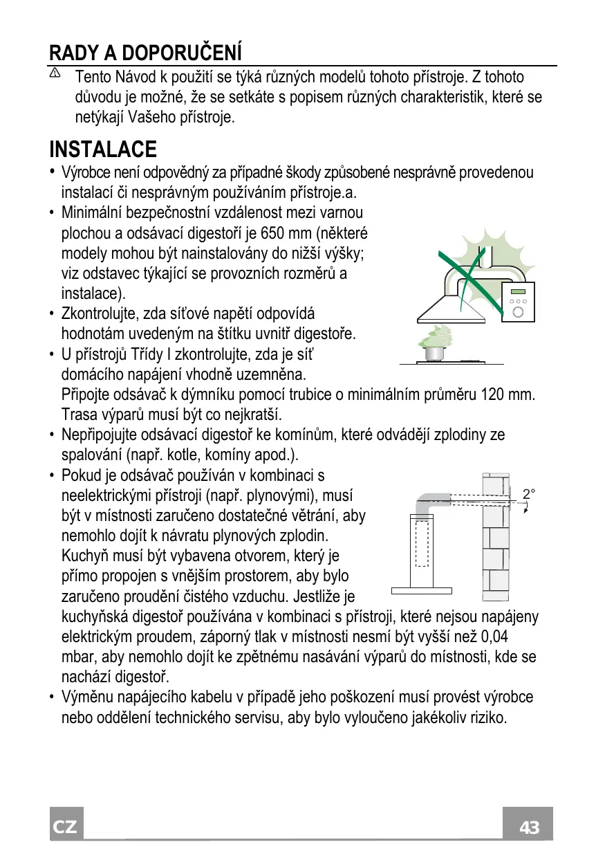 - Nepřipojujte odsávací digestoř ke komínům, které odvádějí zplodiny ze spalování (např. kotle, komíny apod.).