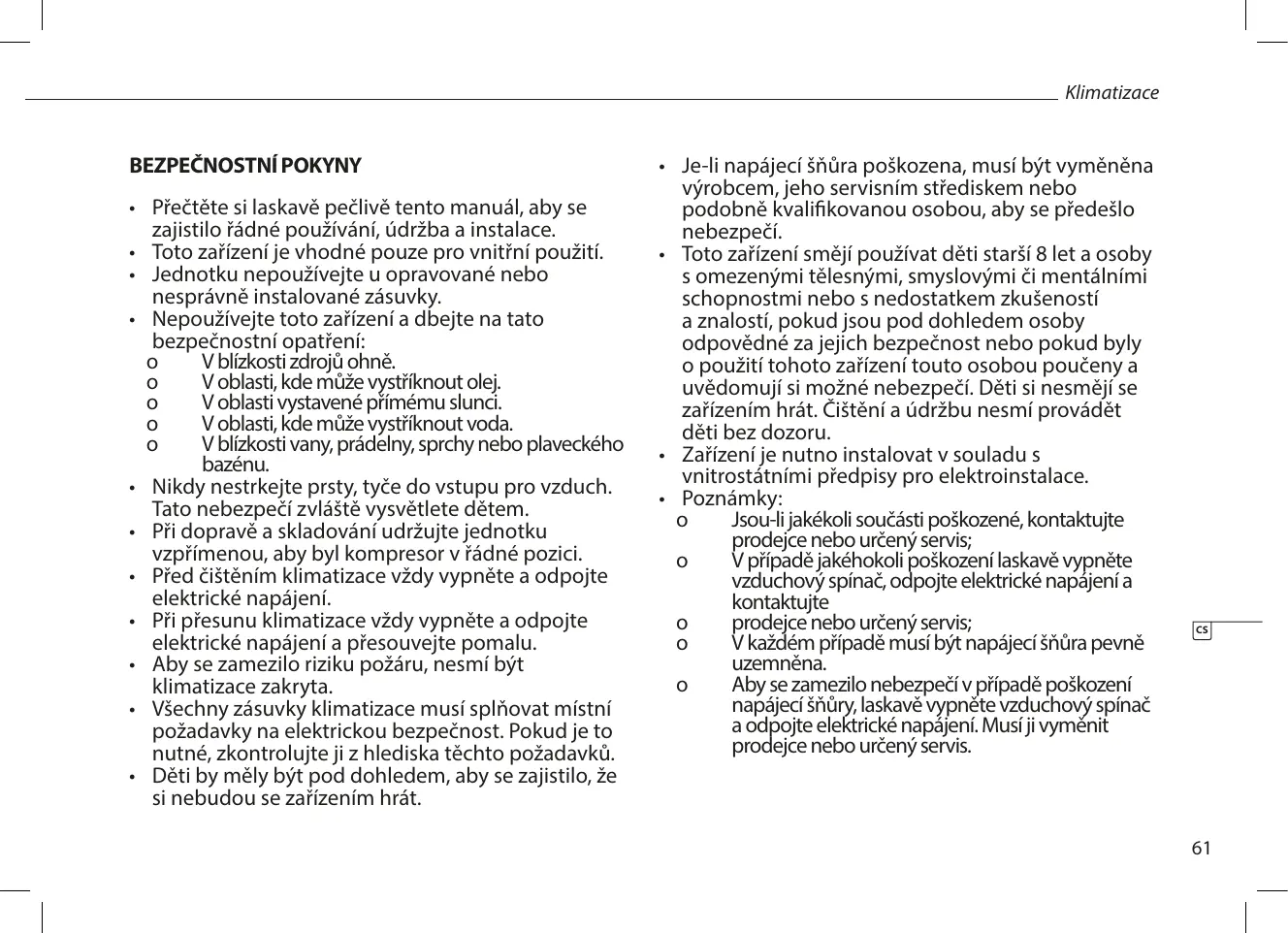 - Aby se zamezilo riziku požáru, nesmí být klimatizace zakryta.