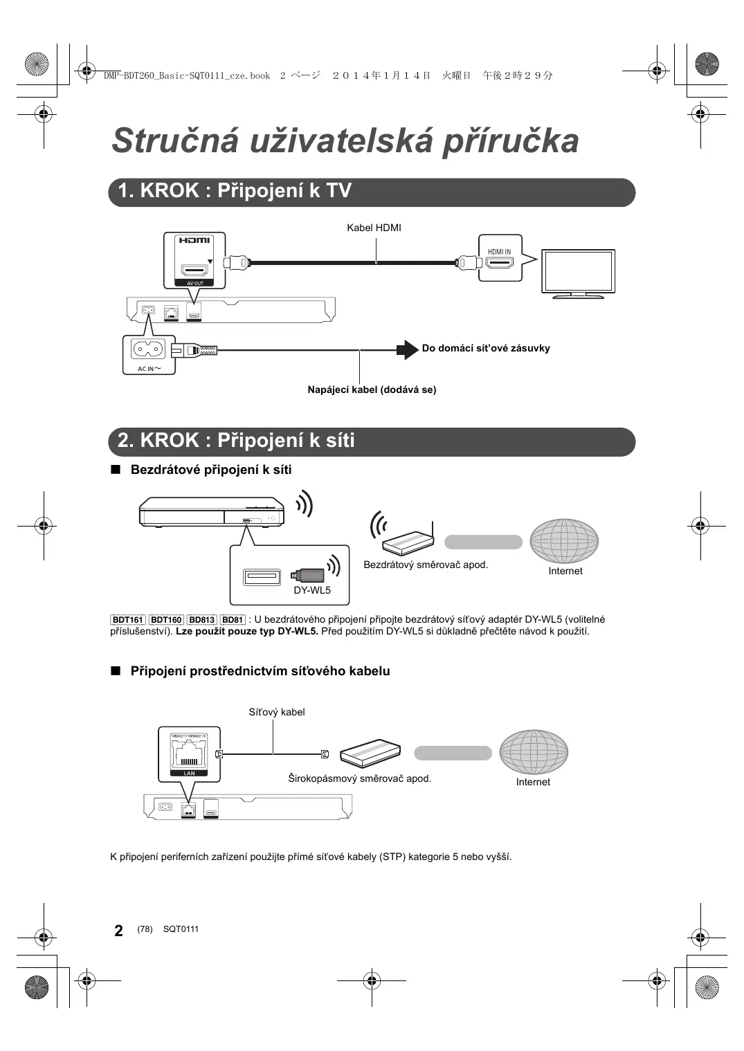 ∫ Bezdrátové připojení k síti Bezdrátový směrovač apod. Internet DY-WL5 [BDT161] [BDT160] [BD813] [BD81] : U bezdrátového připojení připojte bezdrátový síťový adaptér DY-WL5 (volitelné příslušenství). Lze použít pouze typ DY-WL5. Před použitím DY-WL5 si důkladně přečtěte návod k použití. ∫ Připojení prostřednictvím síťového kabelu Síťový kabel Širokopásmový směrovač apod. K připojení periferních zařízení použijte přímé síťové kabely (STP) kategorie 5 nebo vyšší.