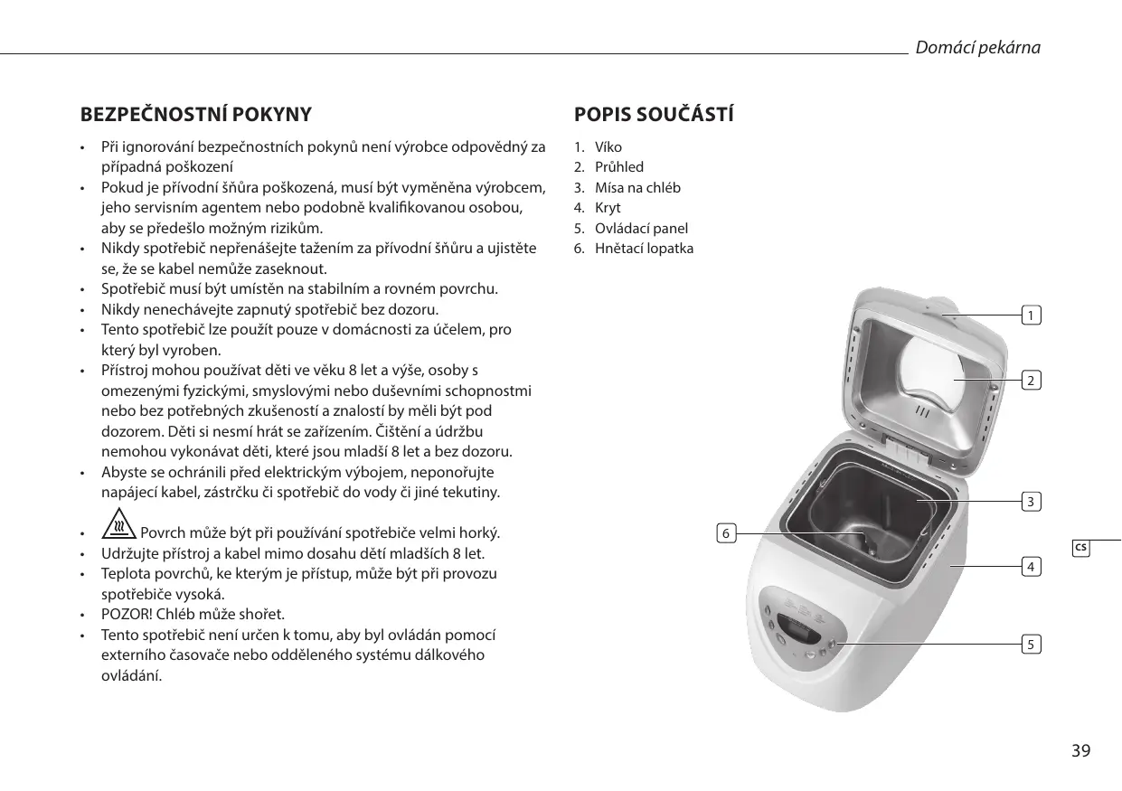 Při ignorování bezpečnostních pokynů není výrobce odpovědný za případná poškození Pokud je přívodní šňůra poškozená, musí být vyměněna výrobcem, jeho servisním agentem nebo podobně kvalifikovanou osobou, aby se předešlo možným rizikům. Nikdy spotřebič nepřenášejte tažením za přívodní šňůru a ujistěte se, že se kabel nemůže zaseknout. Spotřebič musí být umístěn na stabilním a rovném povrchu. Nikdy nenechávejte zapnutý spotřebič bez dozoru. Tento spotřebič lze použít pouze v domácnosti za účelem, pro který byl vyroben. Přístroj mohou používat děti ve věku 8 let a výše, osoby s omezenými fyzickými, smyslovými nebo duševními schopnostmi nebo bez potřebných zkušeností a znalostí by měli být pod dozorem. Děti si nesmí hrát se zařízením. Čištění a údržbu nemohou vykonávat děti, které jsou mladší 8 let a bez dozoru. Abyste se ochránili před elektrickým výbojem, neponořujte napájecí kabel, zástrčku či spotřebič do vody či jiné tekutiny. Povrch může být při používání spotřebiče velmi horký. Udržujte přístroj a kabel mimo dosahu dětí mladších 8 let. Teplota povrchů, ke kterým je přístup, může být při provozu spotřebiče vysoká. POZOR! Chléb může shořet. Tento spotřebič není určen k tomu, aby byl ovládán pomocí externího časovače nebo odděleného systému dálkového ovládání. Víko Průhled Mísa na chléb Kryt Ovládací panel Hnětací lopatka