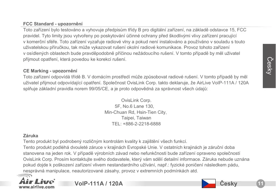 Záruka Tento produkt byl podrobený rozličným kontrolám kvality k zajištění všech funkcí. Tento produkt podléhá dvouleté záruce v krajinách Evropské Unie. V ostatních krajinách je záruční doba stanovena na jeden rok. V případě výrobních závad nebo nefunkčnosti bude zařízení opraveno společností OvisLink Corp. Prosím kontaktujte svého dodavatele, který vám sdělí detailní informace. Záruka nebude uznána pokud dojde k poškození zařízení vlivem nestandardního užívání, např.: fyzické poničení následkem pádu, nesprávná manipulace, neautorizované zásahy, provoz v extremních podmínkách atd. VoIP-111A / 120A Česky